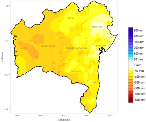Segundo dados apresentados pela Coordenação de Monitoramento (COMON), do Instituto do Meio Ambiente e Recursos Hídricos (Inema), o mês de janeiro fechou com chuvas significativamente abaixo da média em praticamente todo o território baiano. Em Salvador, nesse mês de janeiro foram registrados 62,0 mm de chuva, enquanto que a média histórica é de 82,5 mm.