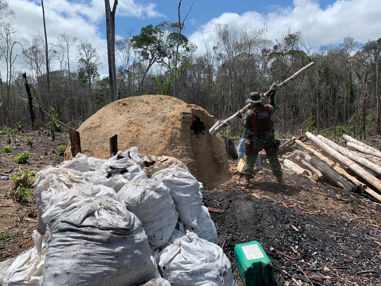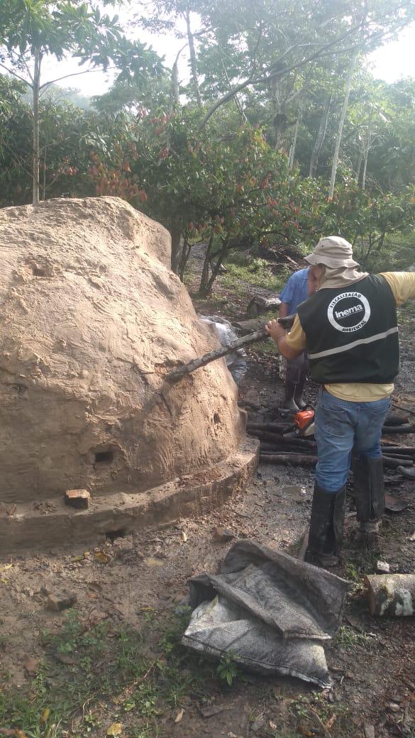 Além disso, também foram recolhidos 7 m³ de madeira nativa desdobrada em pranchões, alguns exemplares de caibros e de ripões, evidentemente sem comprovação de origem florestal legal, sendo este material originário de inspeção em uma serraria no deslocamento entre os municípios. Posteriormente, esse mesmo material foi doado para a Prefeitura Municipal de Santa Luzia. Na ocasião, também foram demolidos 3 (três) formos que eram utilizados para a produção ilegal de carvão, provenientes de desmatamento ilegal.