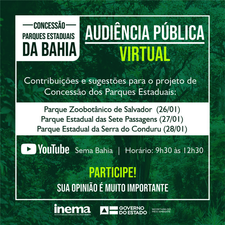 Serão realizadas audiências públicas específicas: Parque Zoobotânico (26/01), Sete Passagens (27/01) e Conduru (28/01), sempre das 9h30 às 12h30, em formato exclusivamente virtual, pelo canal do YouTube da Sema. O público poderá participar e se manifestar por meio de formulário que ficará disponível em cada transmissão.