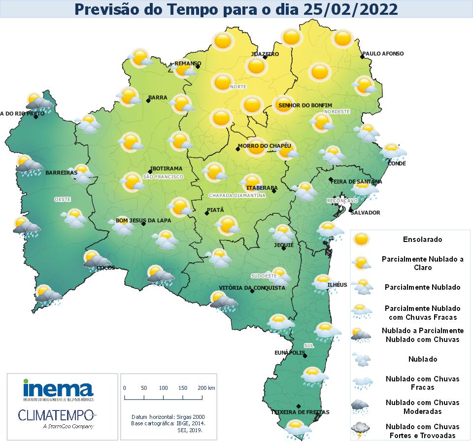 Nesta sexta-feira (25), Um sistema de alta pressão manterá boa parte do estado com condição estável e tempo firme. Região Nordeste, Norte, Chapada Diamantina e parte da região São Francisco deverão apresentar tempo firme e céu claro. Municípios costeiros sofrem influencia do transporte de umidade oceânica e deverão apresentar chuvas no período da manhã, com redução de volumes e tendência de tempo firme no fim do dia. Extremo Oeste da Bahia e cidades que fazem fronteira com o estado de Minas Gerais possuem chances de pancadas de chuvas a partir do fim da tarde.