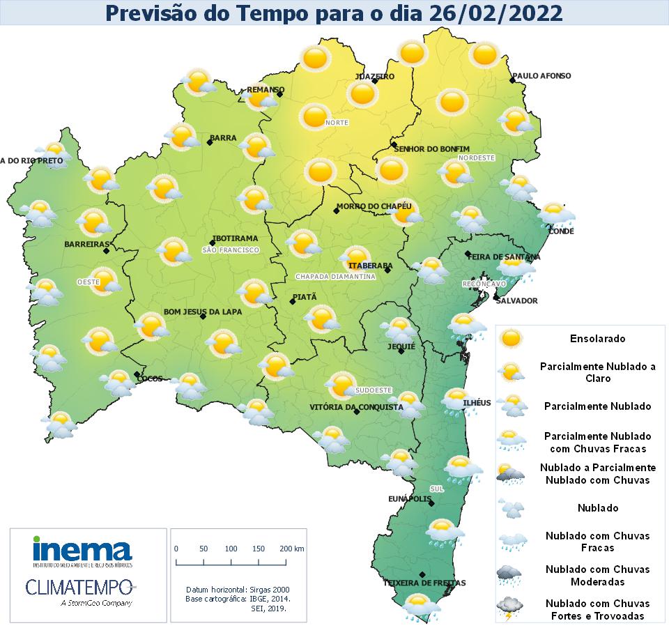 No sábado (26), a previsão será de estabilidade em praticamente todo o estado. O dia começará com chuvas em toda a zona costeira da Bahia, no entanto, a partir da metade do dia as chuvas deverão atuar de forma isolada no litoral do Recôncavo e litoral Nordeste e cessar em todo o litoral Sul. Nas regiões centrais do estado, o dia deverá apresentar tempo firme, com céu claro e altas temperaturas. Extremo Oeste do estado e cidades que fazem fronteira com o estado de Minas Gerais terão o dia com sol entre nuvens a céu claro e deverão apresentar tempo firme.