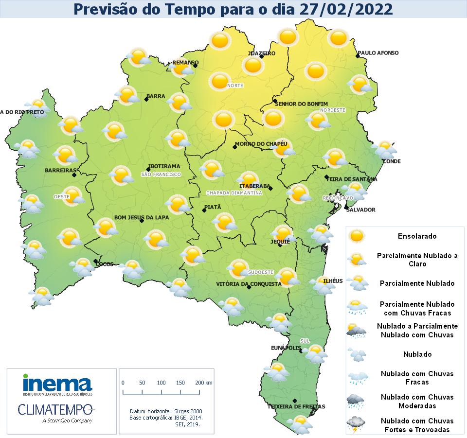 Já no domingo (27), o tempo apresentará estabilidade atmosférica em todo o estado da Bahia. Um centro de alta pressão manterá as regiões Norte, Nordeste, Chapada Diamantina e São Francisco com tempo firme e céu claro, possibilitando um dia com altas temperaturas nas cidades dessas regiões. Ao longo da costa, o dia deverá apresentar uma maior nebulosidade no início da manhã, com uma redução gradual na cobertura de nuvens e tempo firme ao longo de todo o período. Nas demais localidades, sol entre nuvens a céu claro e tempo firme.