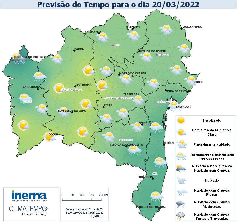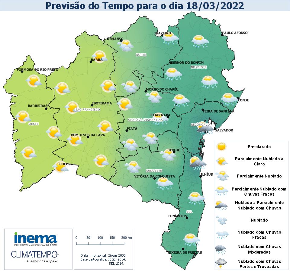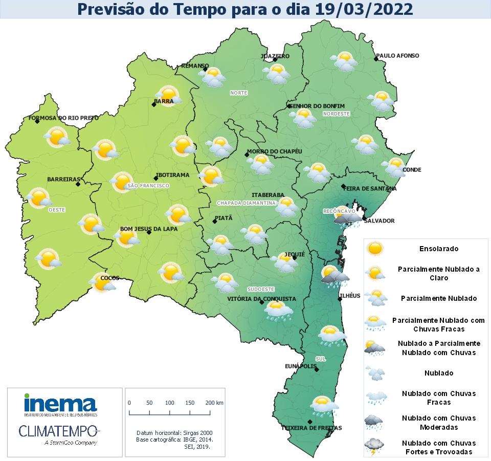 Para a as regiões do Recôncavo, Sul e parte do Nordeste, Chapada Diamantina, Norte e Sudoeste, a previsão para esta sexta-feira é de céu nublado a parcialmente nublado com chances de chuva, sobretudo na faixa litorânea. Nas demais regiões do Estado o céu permanecerá com variação de nebulosidade e sem ocorrência de chuva.