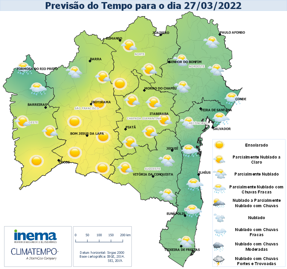 Para o sábado (26) não são esperadas mudanças nas condições do tempo na Bahia. Poderão ocorrer chuvas fracas durante a madrugada e início da manhã em alguns pontos do Recôncavo, incluindo Salvador e RMS, e litoral norte. No decorrer do dia o sol deve predominar nestas áreas. Já no restante do Estado, o céu permanecerá variando de parcialmente nublado a claro e sem chuva no decorrer de todo o período.