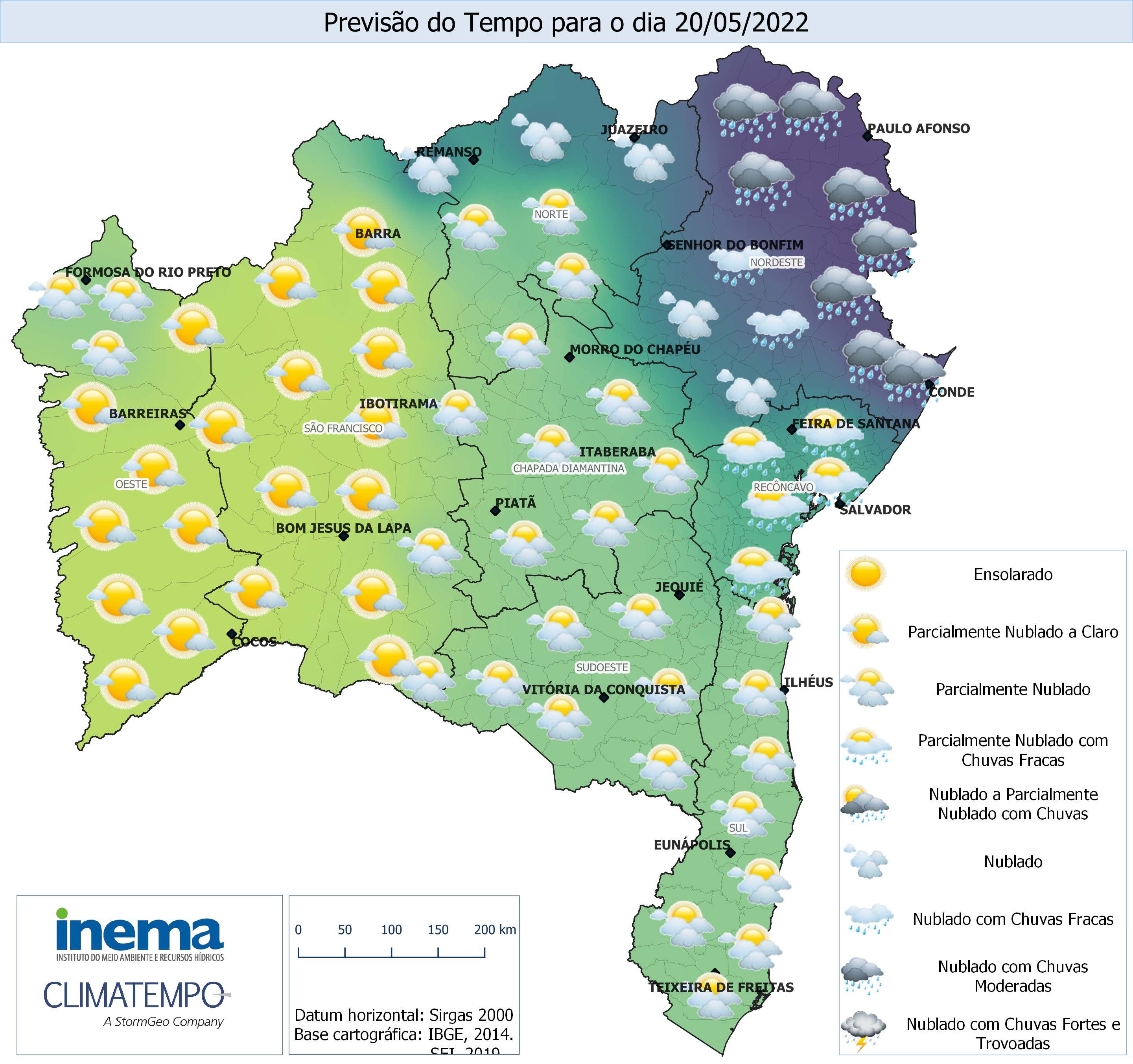 Nesta sexta-feira (20), perturbações em níveis médios e altos da atmosfera deixam o tempo instável com chuvas fracas/moderada a ocasionalmente fortes no nordeste da Bahia, sobretudo nas divisas com os estados de SE, AL e PE. Nos municípios do litoral norte, incluindo Salvador, a nebulosidade ficará variável e poderão ocorrer chuvas isoladas de fraca intensidade. No restante das áreas costeiras, o céu ficará parcialmente nublado com períodos de nublado. No centro-oeste baiano, a baixa umidade inibe a formação de nuvens de chuva.