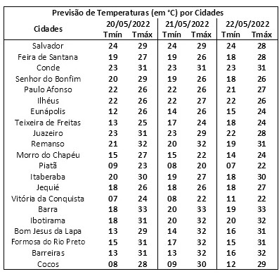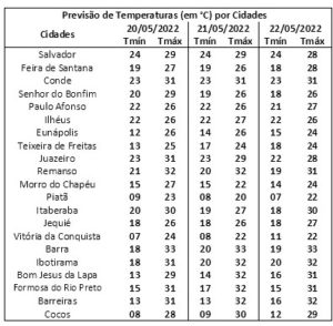 No decorrer do sábado (21), ainda poderão ocorrer chuvas no nordeste da Bahia, nas divisas com os estados de SE, AL e PE, porém, com menor intensidade e de forma isolada. Nos municípios litorâneos espera-se variação de nebulosidade com possibilidade de chuvas isoladas de fraca intensidade. Nas demais áreas no estado, o tempo segue firme.
