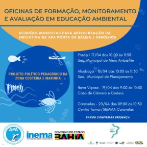 O Instituto do Meio Ambiente e Recursos Hídricos (Inema), por meio da Diretoria de Sustentabilidade e Conservação (DISUC), com apoio do Projeto GEF Mar e do Fundo Brasileiro para a Biodiversidade (Funbio), promove entre os dias 17 e 20/04, encontros para apresentação de projeto de educação ambiental com foco em monitoramento e avaliação em Caravelas, Alcobaça, Prado e Nova Viçosa, no extremo sul do estado. Para participar das reuniões, os interessados devem confirmar presença através do link https://curt.link/a2FD1b .