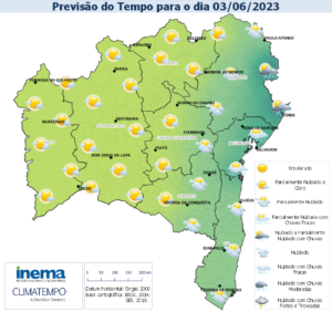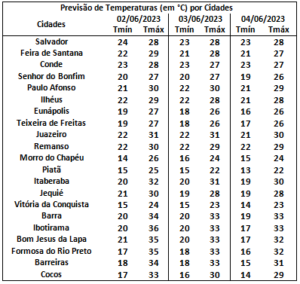 Para o sábado (03), as condições meteorológicas permanecerão semelhantes às condições do dia anterior, ou seja, previsão de pancadas de chuva de fraca intensidade na porção Nordeste do litoral, no qual, as chuvas deverão ser mais frequentes na madrugada e manhã. Na capital Salvador a previsão indica predomínio de tempo firme com possibilidade de chuvas isoladas no decorrer do dia. Já no interior do estado da Bahia, o tempo permanecerá firme com predomínio de sol entre poucas nuvens.