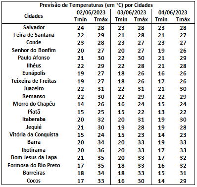 Nesta sexta-feira (02), o tempo permanecerá firme em praticamente todo o estado da Bahia, sendo que, existem possibilidades de chuvas apenas na faixa costeira do estado com previsão de pancadas de chuvas de fraca intensidade, sobretudo na porção entre o Litoral Nordeste e Fronteira com o estado de Sergipe. Nas Mesorregiões Oeste, São Francisco, Chapada Diamantina, Norte e Sudoeste, o tempo estará firme com predomínio de sol entre poucas nuvens. A temperatura na capital baiana oscilará entre 24oC e 28oC.