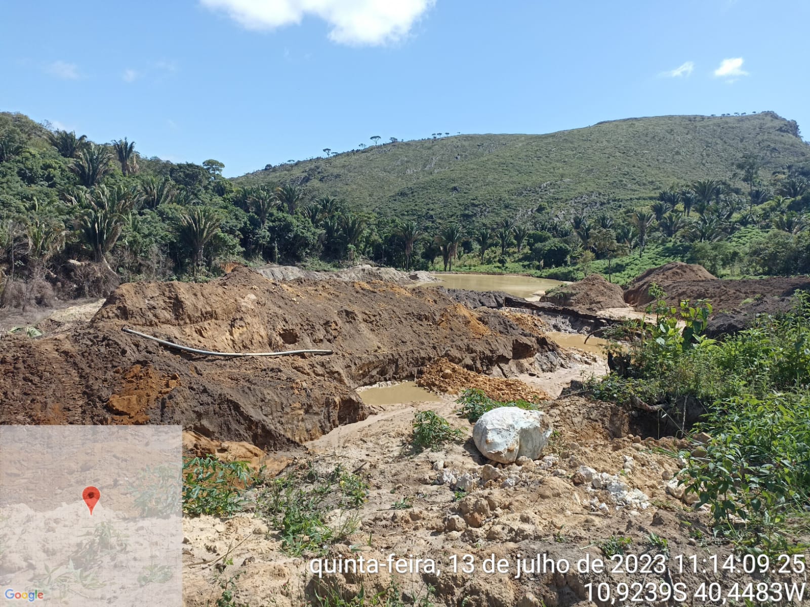 Nesta quinta-feira (13), em resposta à demanda do Comitê da Bacia Hidrográfica do Rio Itapicuru, uma equipe de fiscalização do Instituto do Meio Ambiente e Recursos Hídricos (INEMA), em ação conjunta com a Polícia Militar do Estado da Bahia (PMBA), esteve no município de Saúde, localizado na região próxima à Serra da Jacobina. O objetivo da equipe era investigar denúncias sobre a coloração do rio Payaya e confirmar suspeitas de atividades ilegais de garimpo de ouro na nascente do rio.