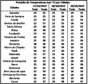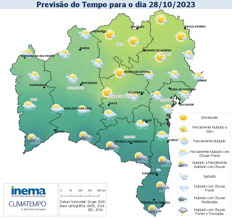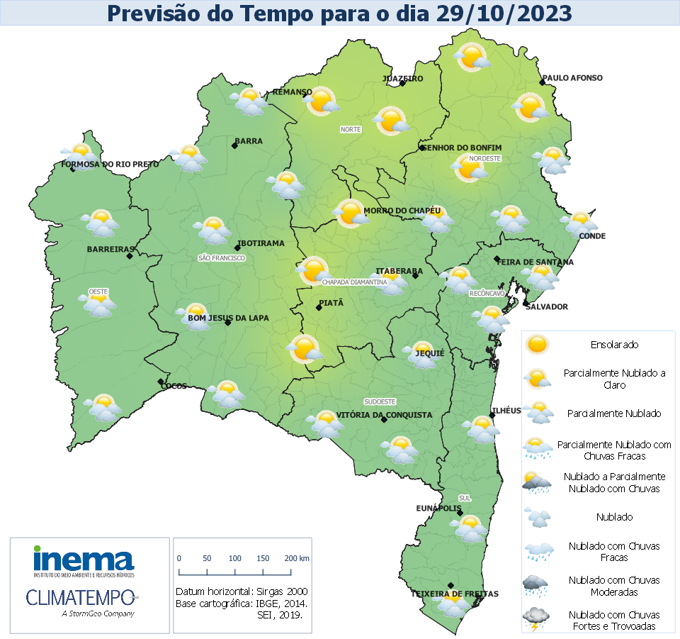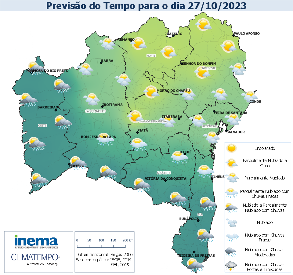 Para o sábado, o tempo estará estável e o sol predominará em todo o centro-norte da Bahia. No extremo leste do estado haverá variação de nebulosidade e possibilidade de pancadas de chuva de fraca intensidade devido a alta disponibilidade de umidade oceânica nos municípios costeiros do litoral Sul. Nas mesorregiões Oeste e São Francisco, o tempo apresentará possibilidades de chuvas fracas e isoladas na porção Sul dessas regiões. Nas demais regiões do estado, o tempo ficará firme em todo o período.