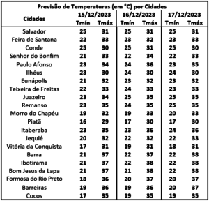 Ao longo do período, os volumes de chuva registrado foram: Ilhéus (13,4 mm), salvador – Tancredo Neves (11 mm) e Valença (10,2 mm). Nas demais localidades os volumes ficaram abaixo de 5 mm de precipitação.