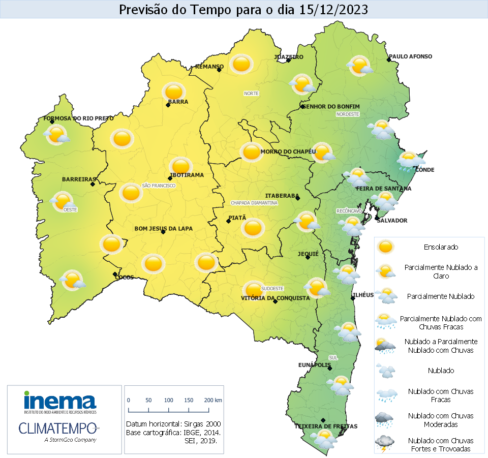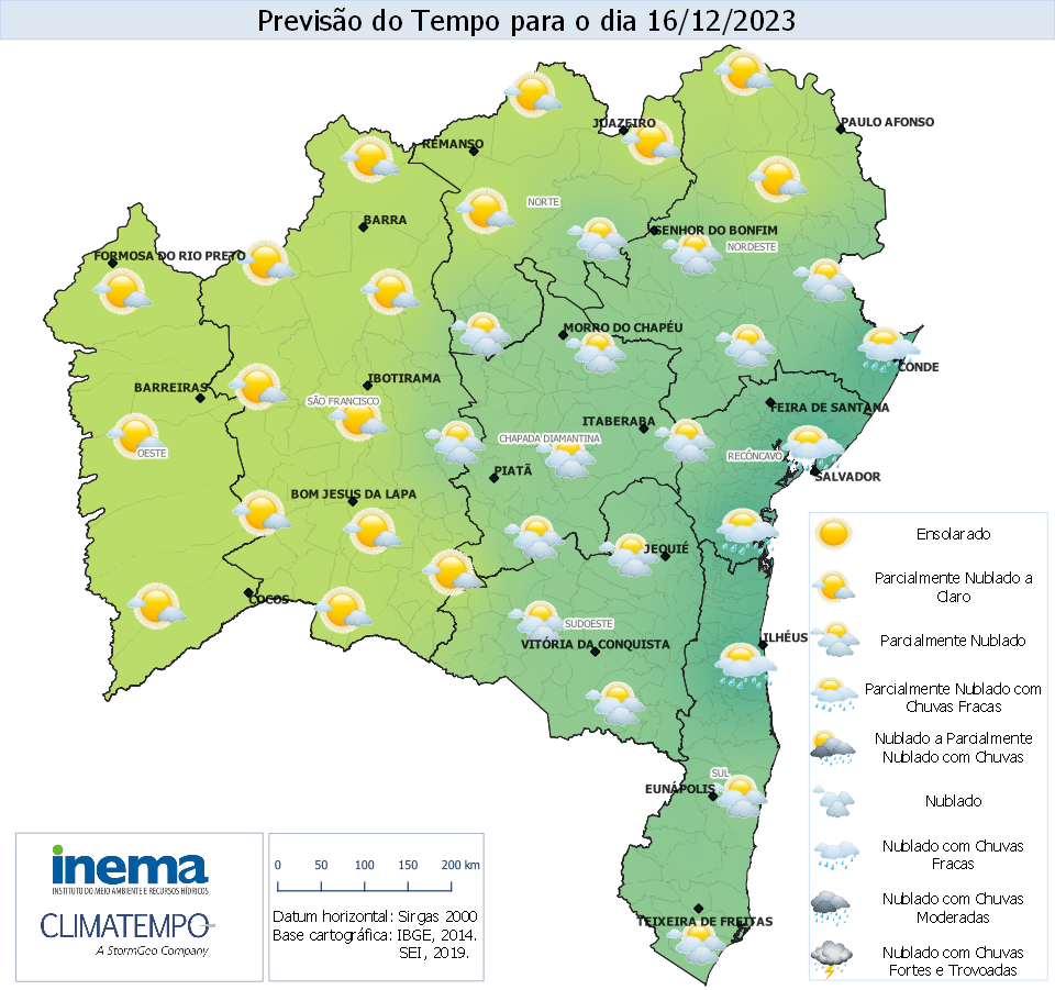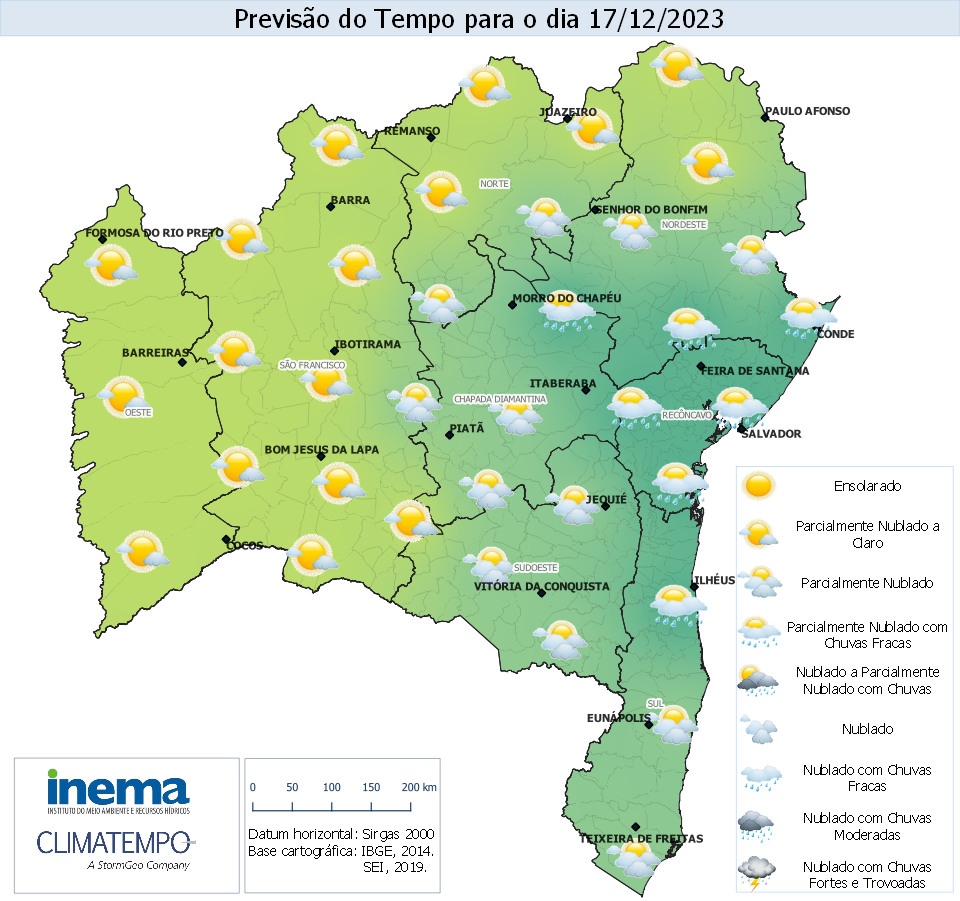 Para esta sexta-feira, as condições atmosféricas seguem estáveis, com predomínio de sol e pouca nebulosidade em praticamente toda a Bahia. No litoral do Recôncavo e Nordeste o dia apresentará uma maior cobertura de nuvens em relação as demais regiões, com possibilidade de pancadas de chuvas isoladas nos municípios costeiros dessas regiões.