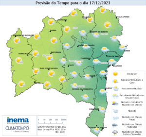 O tempo previsto para o sábado indica condição estável em todo o centro-oeste da Bahia, no qual, o céu permanecerá claro e com altas temperaturas nesse setor. Já na faixa costeira, o direcionamento de umidade do oceano para a costa favorecerá a formação nebulosidade e deixará o dia com possibilidade de chuvas localizadas ao longo dos municípios costeiros.