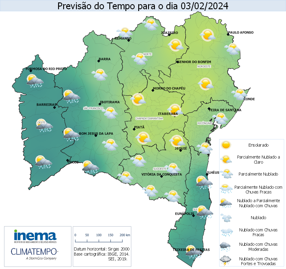 Neste sábado, o tempo se manterá com variação de nebulosidade e condições favoráveis a ocorrência de pancadas de chuvas isoladas ao longo do litoral, sobretudo, nos municípios costeiros do sul do estado. Já no setor centro-oeste da Bahia, a previsão indica variação de nebulosidade e chuva de fraca intensidade, sobretudo na extremidade oeste da Bahia e no período da tarde. Nas demais regiões, o tempo ficará firme em todo o período.