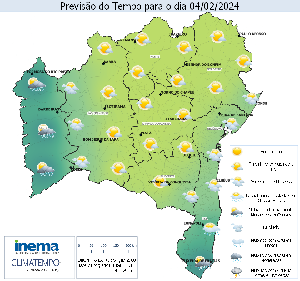 Neste domingo, estão previstas chuvas de fraca intensidade na extremidade oeste do estado, no qual, amanhecerá com tempo firme e apresentará um aumento gradual de nebulosidade ao longo da região. No setor costeiro, incluindo a capital Salvador, o dia apresentará predomínio de tempo firme com sol entre nuvens, sendo que, deverão ocorrer chuvas em formas isoladas apenas na porção litorânea do sul do estado. Nas demais regiões, tempo firme em todo o período.