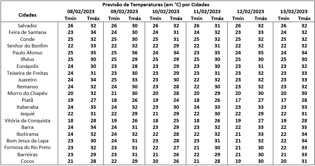 Nesta sexta-feira, o tempo se manterá com variação de nebulosidade e condições favoráveis a ocorrência de chuvas de curta duração no litoral Sul, Recôncavo e Sudoeste. Nas regiões Oeste e São Francisco a previsão indica variação de nebulosidade, com chuvas isoladas. Nas demais regiões, o dia terá períodos de céu nublado com possibilidade de chuva durante o período da tarde e noite.
