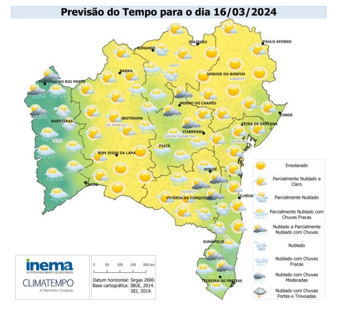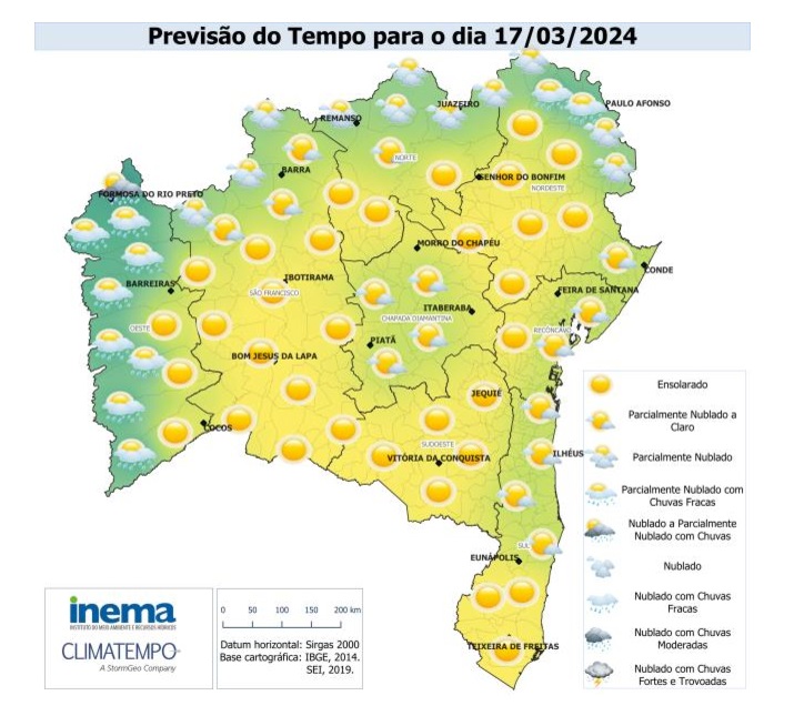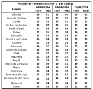Neste domingo, o tempo ficará firme na maior parte do estado. As condições para a região Oeste permanecem as mesmas do dia anterior, ou seja, possibilidade de eventuais ocorrências de chuvas de fraca a moderada. No extremo norte de todo estado espera-se céu parcialmente nublado e com pouca possibilidade de chuva. As temperaturas para todo estado ficarão variando entre 17°C (Piatã) e 36°C (Ibotirama).