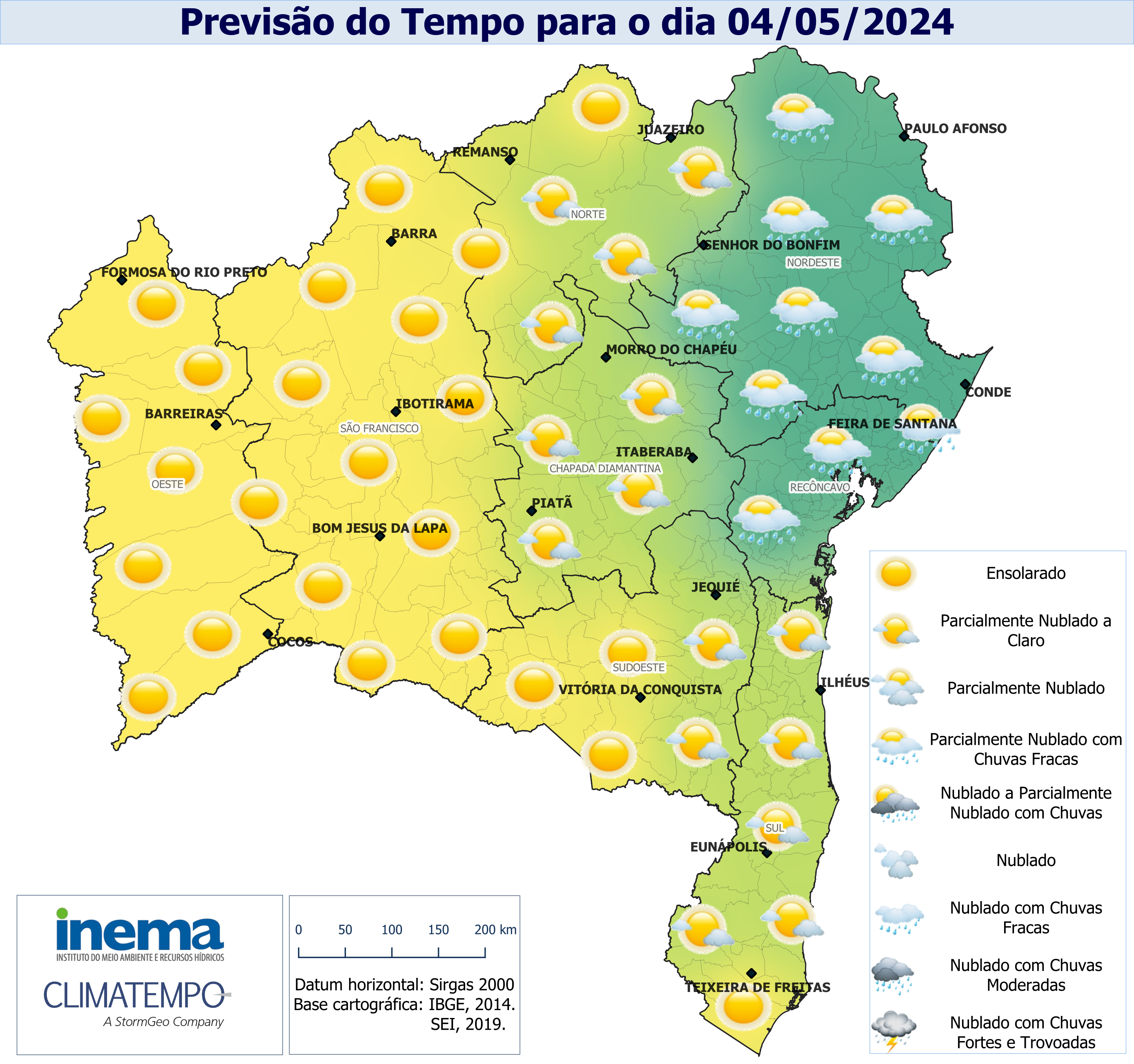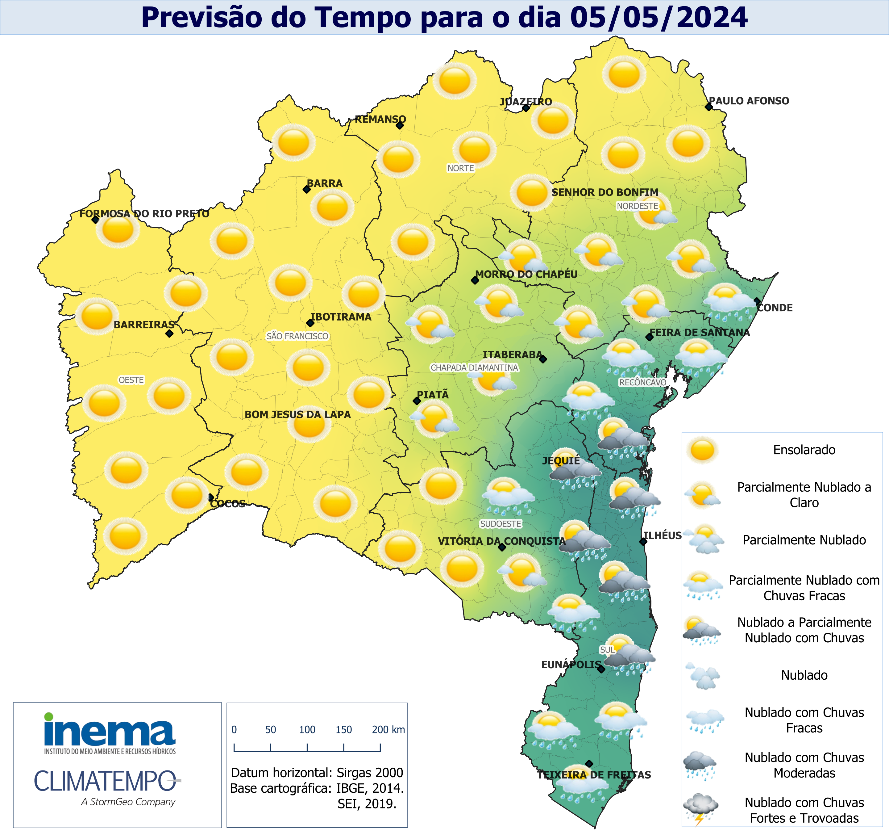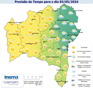 Para o domingo as condições do tempo se tornam favoráveis a ocorrência de chuvas com intensidade fraca a moderada em parte do Recôncavo e principalmente no litoral do baixo Sul do estado. No extremo Sul baiano o sol ficará entre nuvens com possibilidade de pancadas de chuvas. Nas demais regiões o tempo permanecerá com variação de nebulosidade com predomínio de tempo firme.
