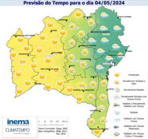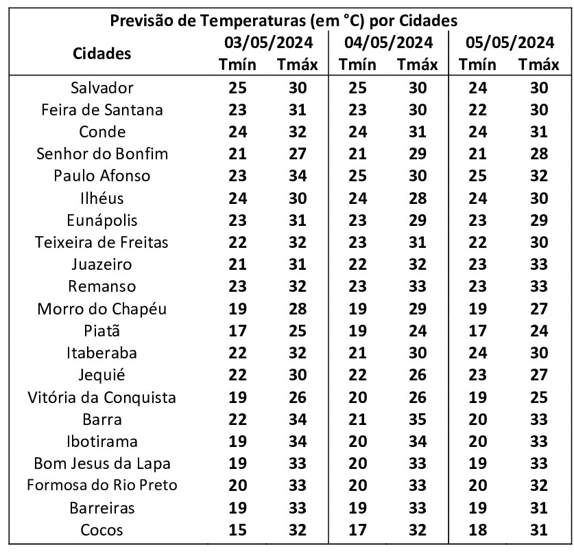 Nesta sexta-feira, O tempo se manterá com configuração semelhante ao dia anterior, ou seja, céu parcialmente nublado com possibilidade de chuvas fracas e pontuais nas regiões do Nordeste e Recôncavo do estado. Nas demais regiões ao longo do dia, o tempo permanecerá firme com pouca nebulosidade. Em todo estado as temperaturas máximas e mínimas variam entre 34°C e 15° C, respectivamente.