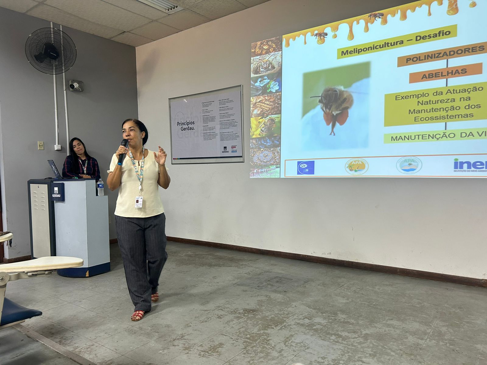 Adriana Castro, coordenadora do Comitê Estadual da Reserva da Biosfera da Mata Atlântica (CERBMA) e gestora da APA Litoral Norte, representou o Inema, palestrando sobre "A importância da meliponicultura para o meio ambiente". Ela ressaltou que o Inema incentiva a prática da meliponicultura nas áreas protegidas devido à importância das abelhas na manutenção dos ecossistemas e ao benefício que essa atividade traz para a renda das comunidades tradicionais.