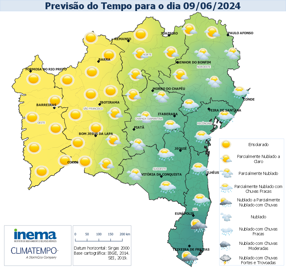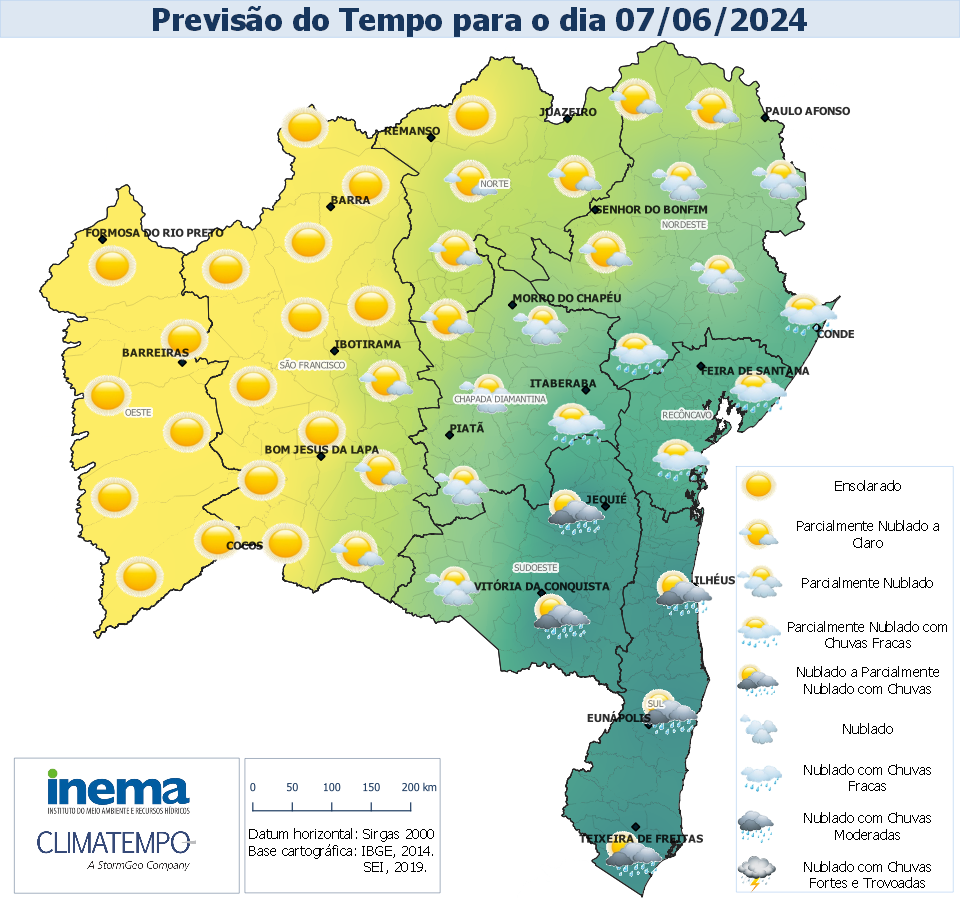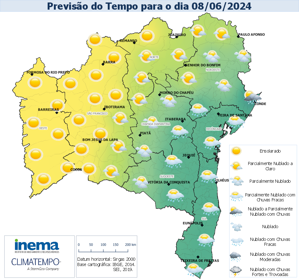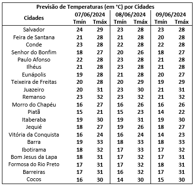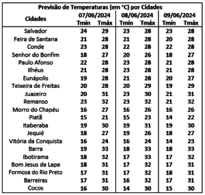 Nesta sexta-feira, O tempo se manterá parcialmente nublado com possibilidade de chuvas fracas e pontuais em algumas localidades da região do Recôncavo e litoral Nordeste. Nas demais localidades litorâneas o tempo ficará com possibilidade de chuvas de intensidade fraca a moderada, sobretudo, no sul do estado. O tempo firme para as demais regiões.