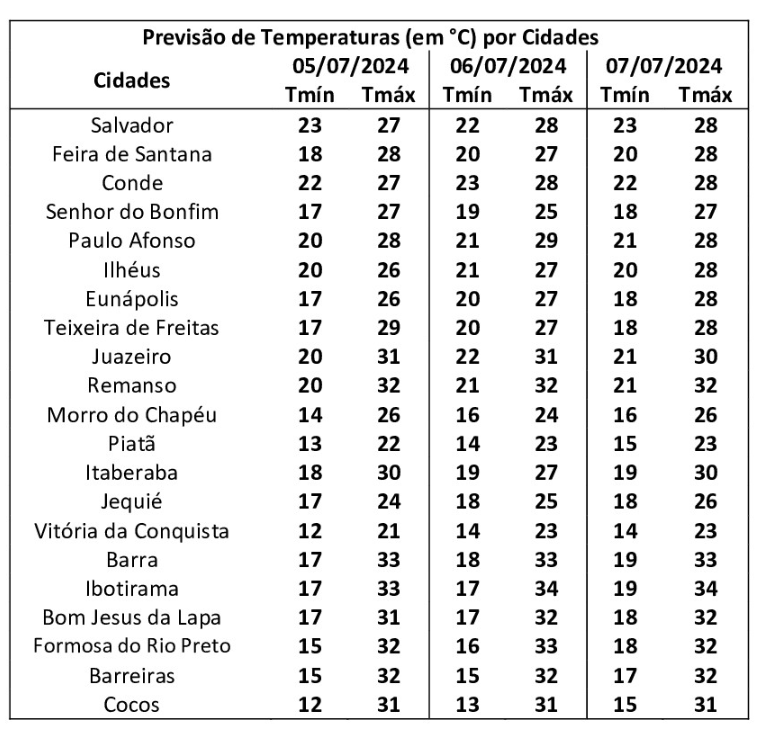 Para o domingo o tempo se manterá firme em praticamente toda a Bahia. Para a faixa centro-oeste a previsão é de céu ensolarado com temperaturas máximas chegando aos 34°C em algumas localidades. No restante do Estado o céu ficará parcialmente nublado a claro, com mínima possibilidade de chuva. Na cidade de Salvador o céu se manterá com variação de nebulosidade e com pequena chance de chuvas. Na capital as temperaturas máximas e mínimas serão de 28°C e 23°C, respectivamente.