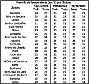 Para o sábado são esperadas condições semelhantes ao dia anterior, ou seja, tempo chuvoso em grande parte do estado. Na Chapada Diamantina, Oeste e São Francisco os dias terão chuvas convectivas de intensidade fraca a moderada, sobretudo, a partir do final da tarde. Já nas regiões do Recôncavo, Sul e Sudoeste o dia apresentará céu parcialmente nublado a claro com possibilidade apenas de chuvas isoladas nesse dia.