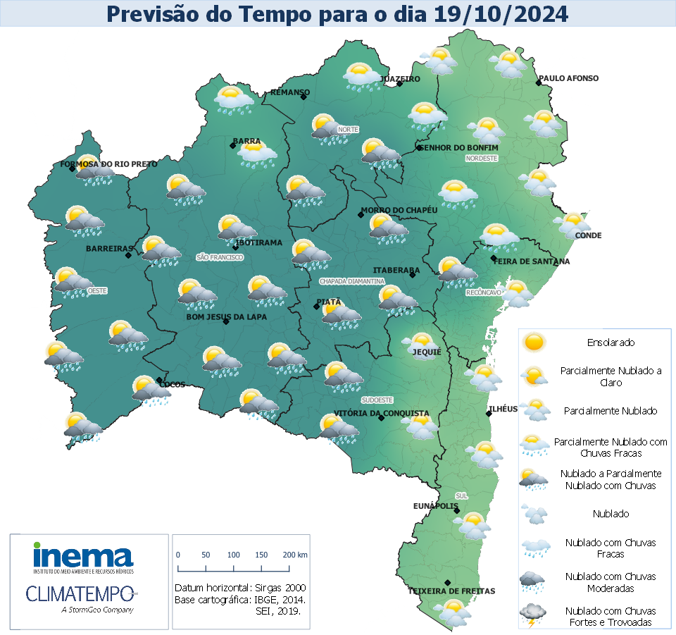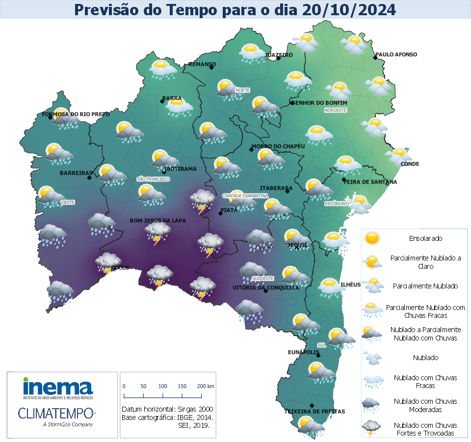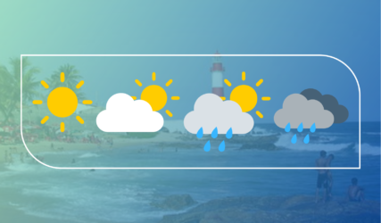 Para o domingo o tempo seguirá instável em quase toda Bahia. No setor costeiro o céu ficará parcialmente nublado a claro, com possibilidade de chuva de fraca intensidade, sobretudo, no litoral Sul. Na faixa oeste do estado é esperado um aumento da nebulosidade com possibilidade de ocorrência de chuvas expressivas que deverão ser acompanhadas de descargas elétricas, sobretudo, na extremidade que faz fronteira com o estado de Minas Gerais.