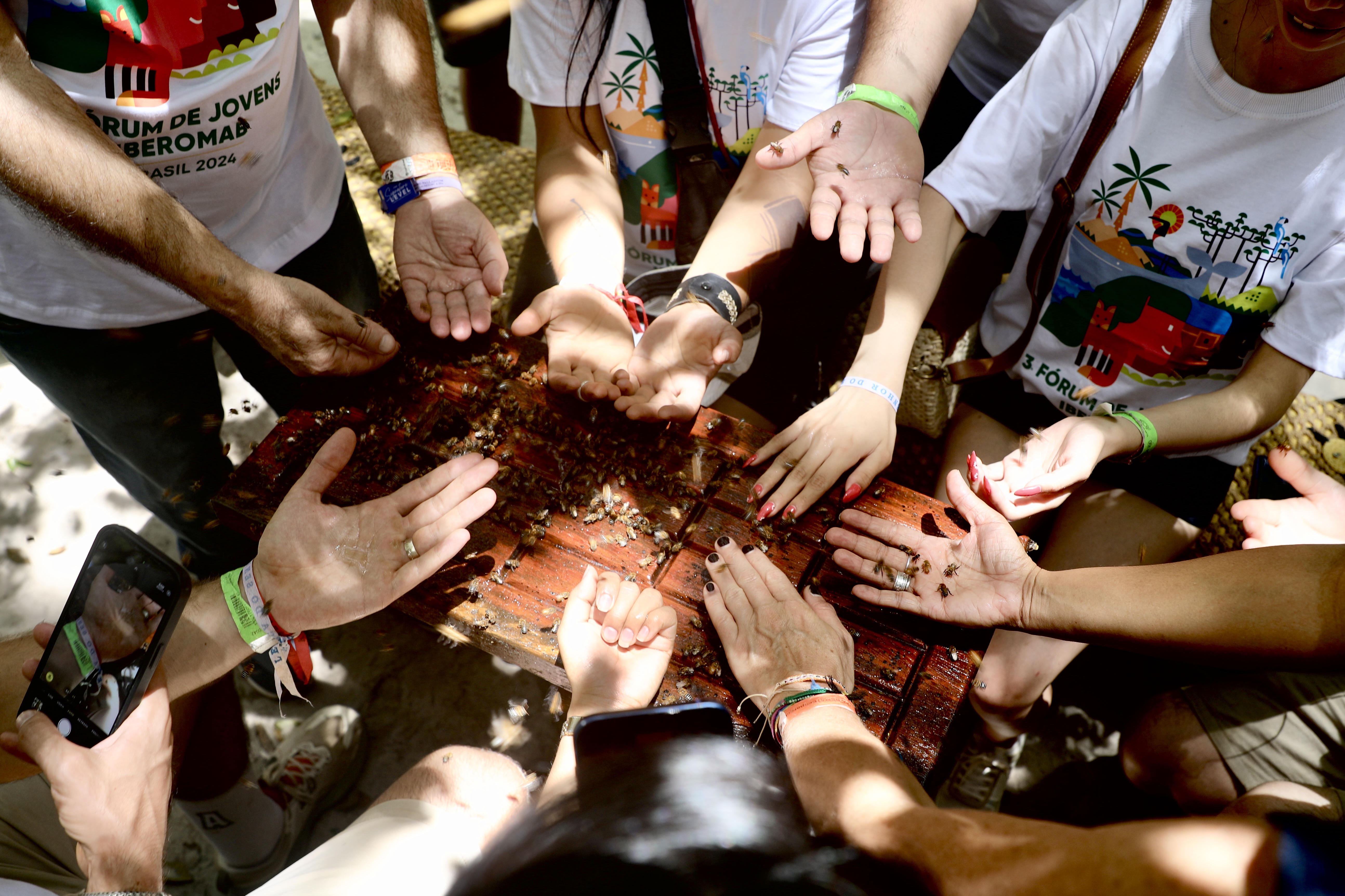 O dia estava repleto de surpresas e muito aprendizado, no meliponário Pólen Dourado, os jovens puderam conhecer o trabalho de conservação de mais de 16 espécies nativas de abelhas sem ferrão, além de uma vivência imersiva de melipoterapia.