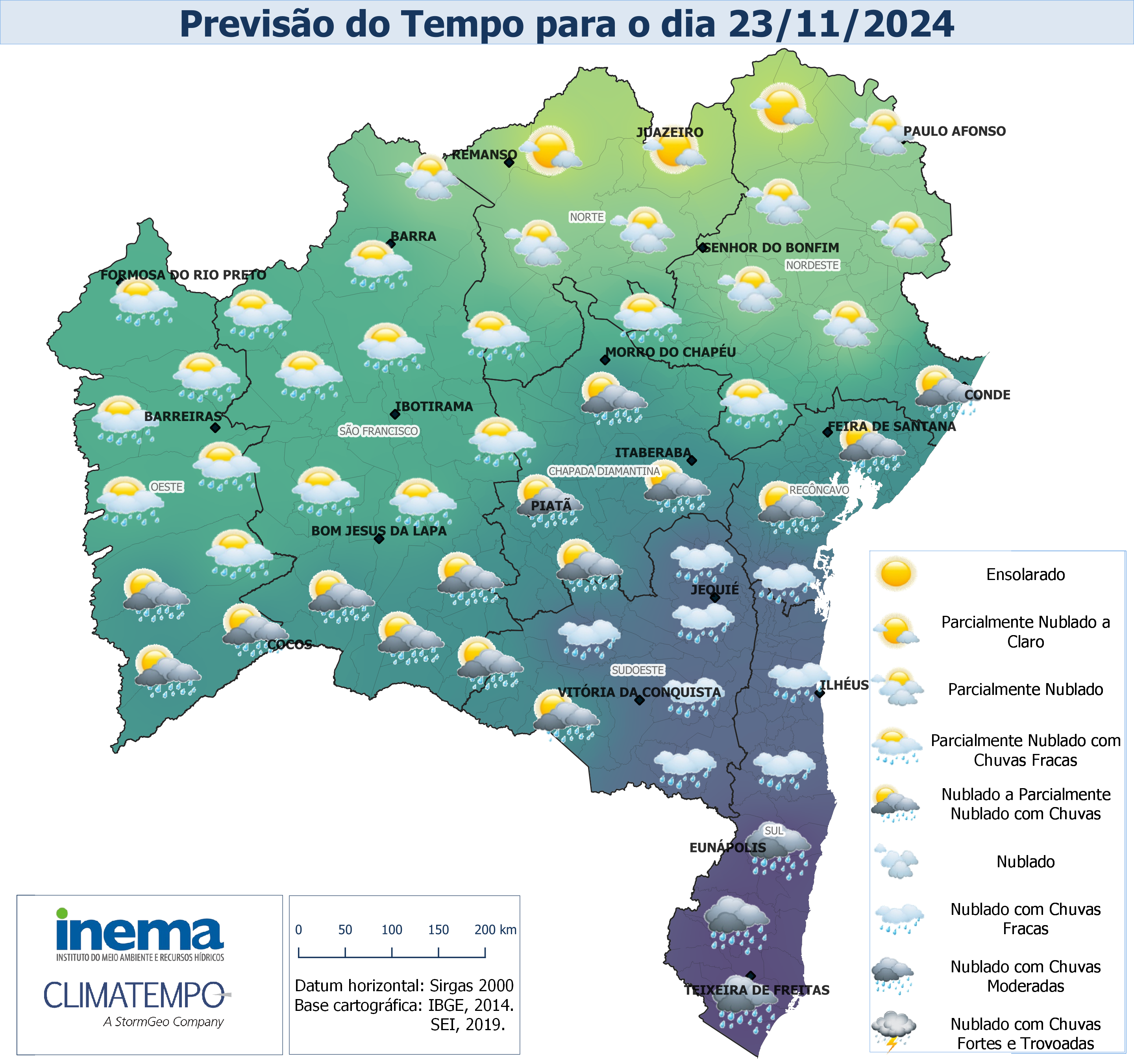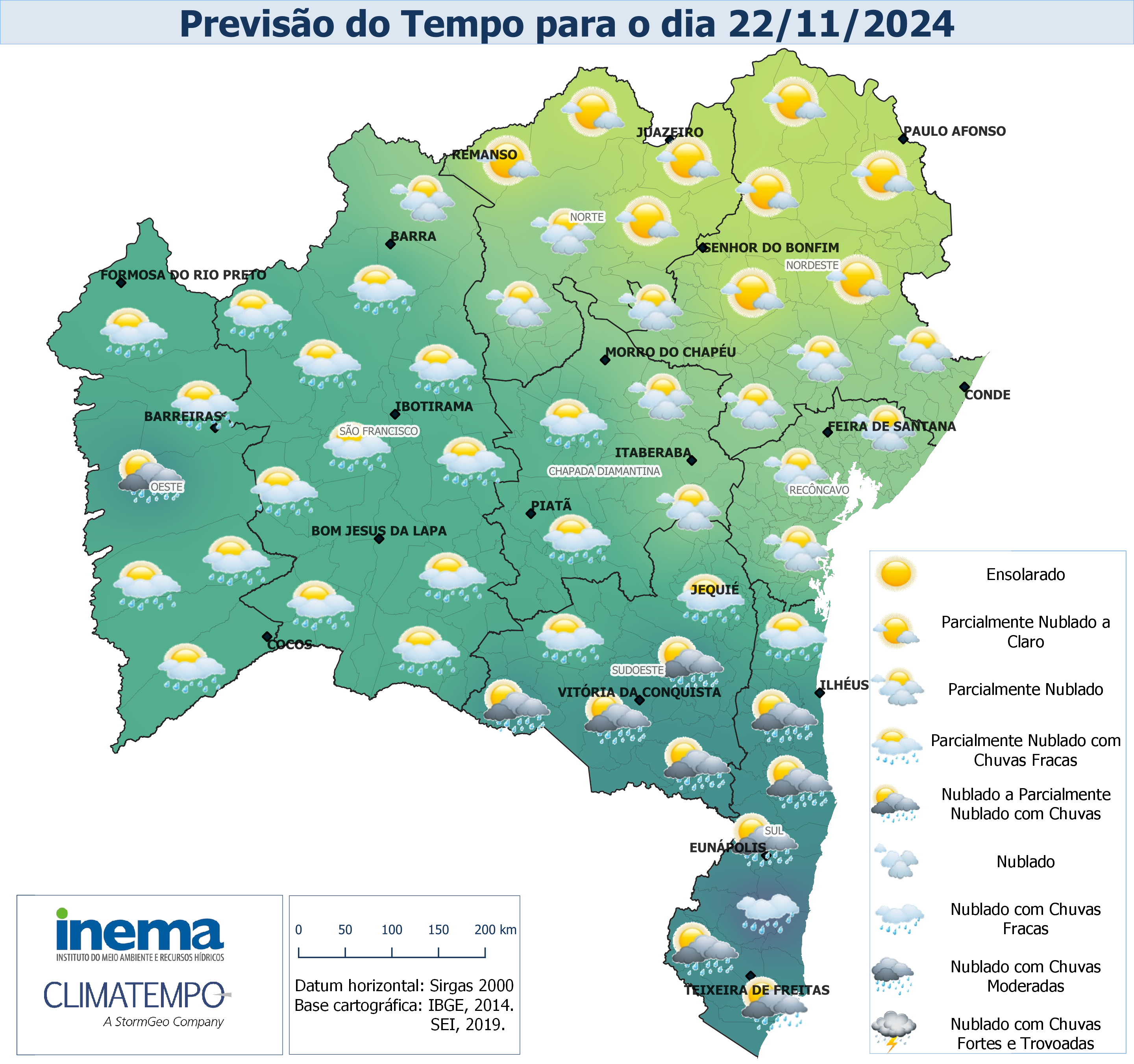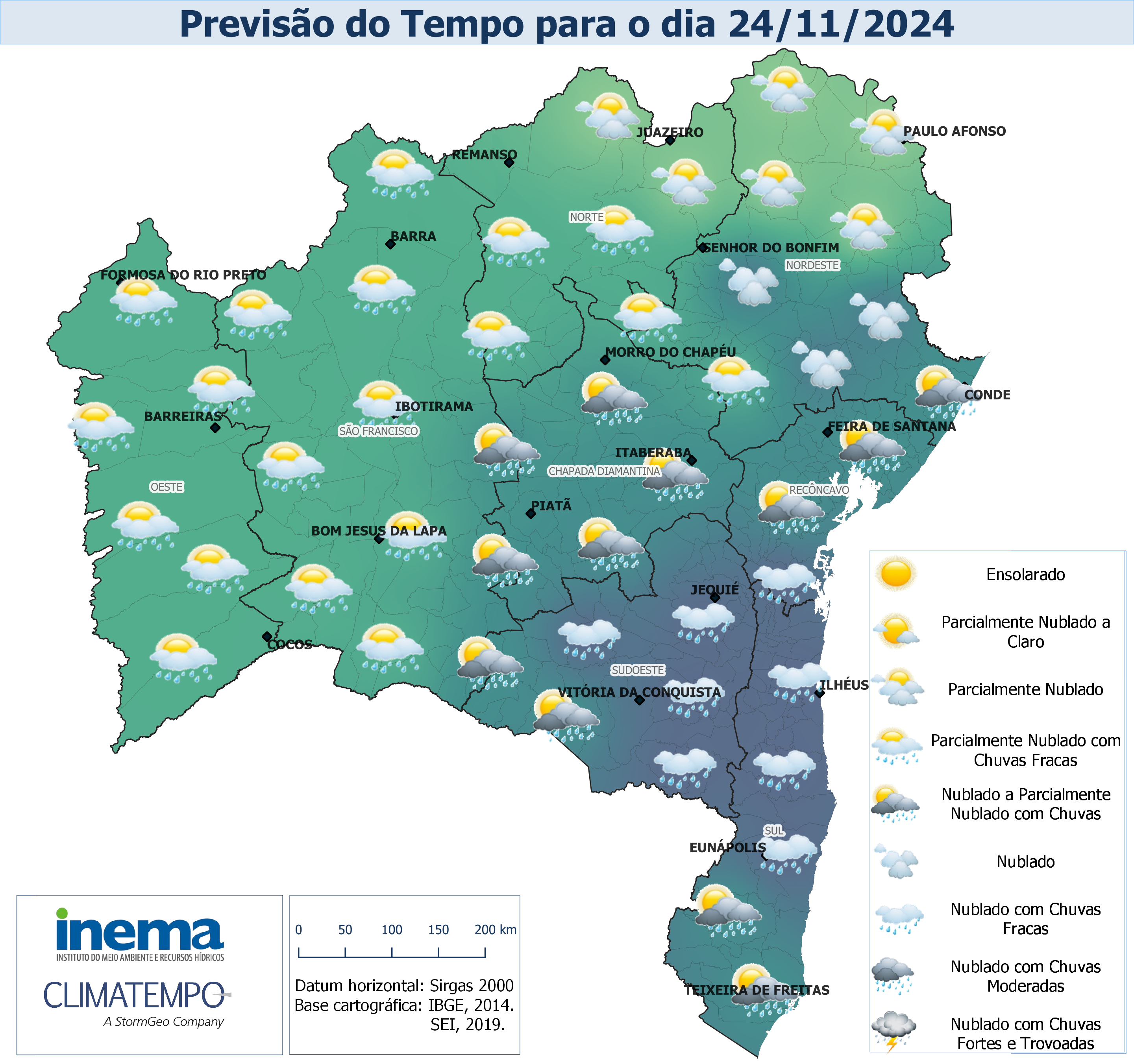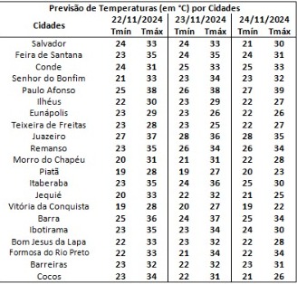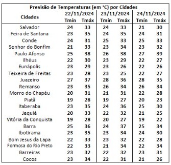 Neste domingo, ainda estão previstas chuvas com intensidade de fraca a moderada na região Sul e Sudeste do estado, sobretudo, no Baixo Sul, devido ao Sistema Frontal. No setor centro-oeste são esperadas chuvas contínuas e de fraca intensidade ao longo do dia. Nas demais regiões o dia apresentará predomínio de tempo firme com sol entre nuvens. Na capital Salvador o dia ficará nublado a parcialmente nublado com chuvas, as temperaturas máximas e mínimas devem variar.