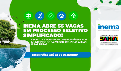 O Instituto do Meio Ambiente e Recursos Hídricos (Inema) deu início nesta segunda-feira (16) ao Processo Seletivo Simplificado em Regime Especial de Direito Administrativo (REDA). Estão disponíveis 55 vagas para profissionais das áreas de Ciências Jurídicas (15), Engenharia Sanitária e Ambiental (12), Ciências Biológicas (13), Medicina Veterinária (10), e Engenharia Florestal (5). As vagas estão distribuídas entre os municípios de Salvador, Cruz das Almas e Barreiras, onde será implantada a terceira unidade do Centro de Triagem de Animais Silvestres (Cetas).