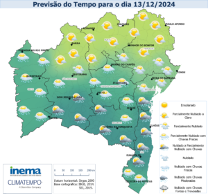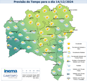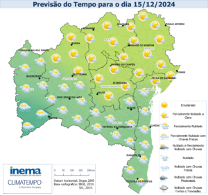 Nesta sexta-feira, o tempo se manterá com variação de nebulosidade e condições favoráveis à ocorrência de chuvas de intensidade fraca nas regiões do centro-sul do estado. Na Capital do estado podem ocorrer pancadas de chuva de forma isolada, devido ao transporte de umidade do oceano em direção a costa. Nas demais regiões a previsão indica variação de nebulosidade com tempo firme e temperaturas elevadas, chegando à máxima de 36°C.