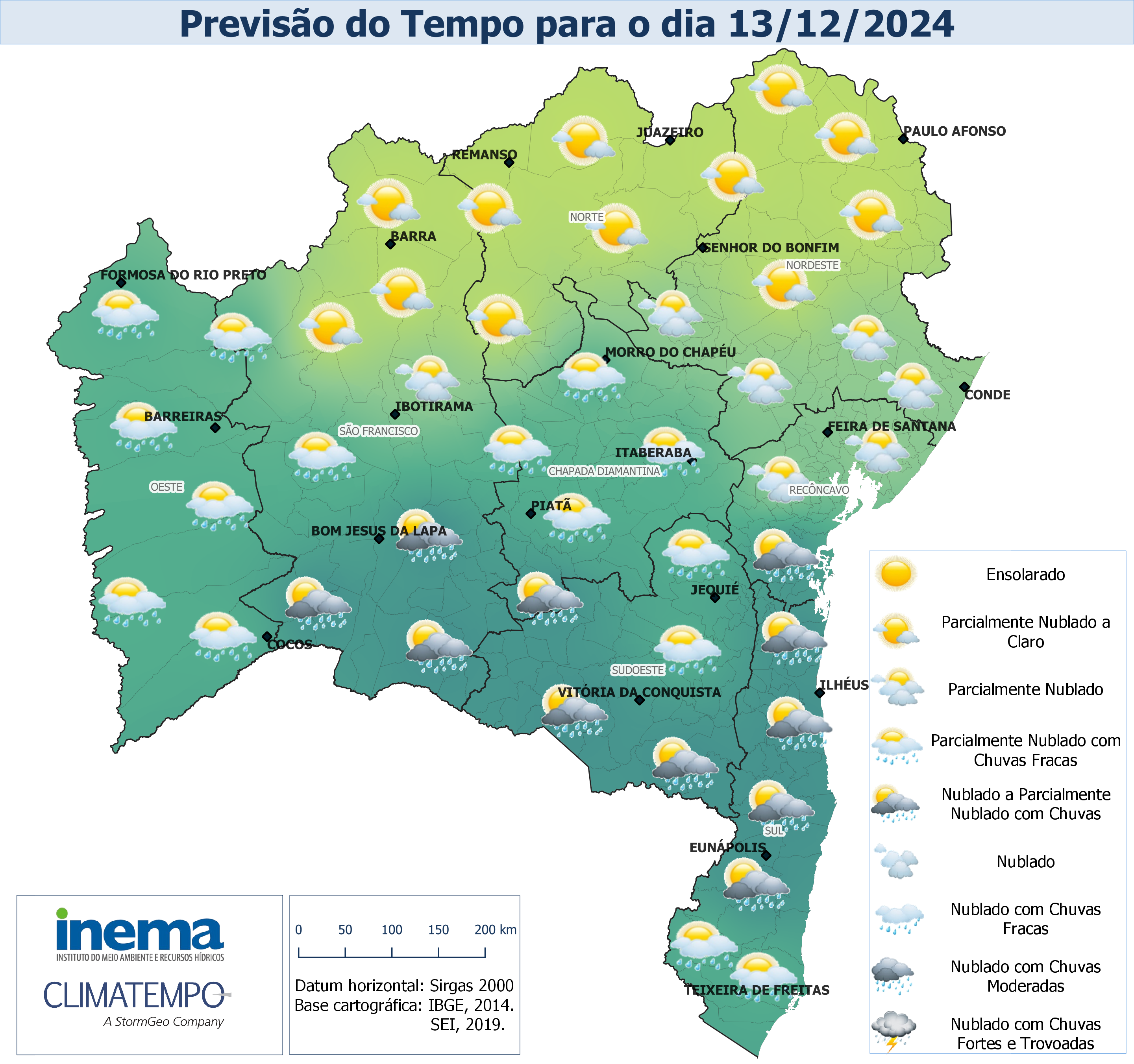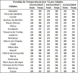 Neste sábado, o tempo se manterá com variação de nebulosidade e condições favoráveis à ocorrência de chuvas com intensidade fraca em localidades do extremo Oeste e em algumas localidades do Baixo Sul baiano. Já no setor centro-norte da Bahia, a previsão indica variação de nebulosidade e tempo firme. Na capital do estado o céu deve apresentar variação de nebulosidade e firme ao longo de todo o período.