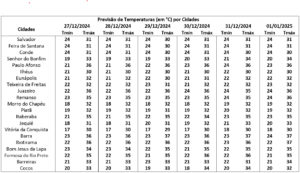 No sábado, a previsão se manterá semelhante ao dia anterior, ou seja, condição de tempo firme em praticamente todo o estado da Bahia, com possibilidade de pancadas de chuvas convectivas no fim da tarde no centro-oeste e municípios que fazem fronteira com o estado de Minas Gerais. Na Chapada Diamantina, Recôncavo e Nordeste, a previsão é de céu claro a sol entre nuvens aliado a altas temperaturas nesse dia, assim como, baixa umidade relativa no Norte do estado.