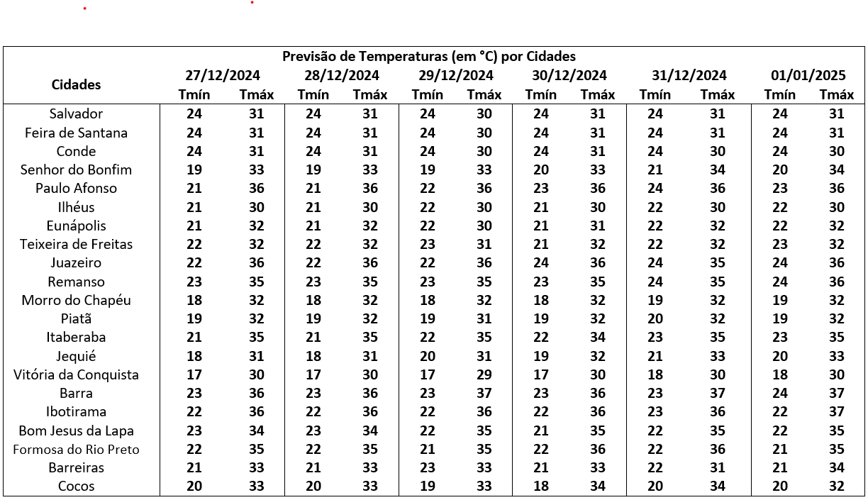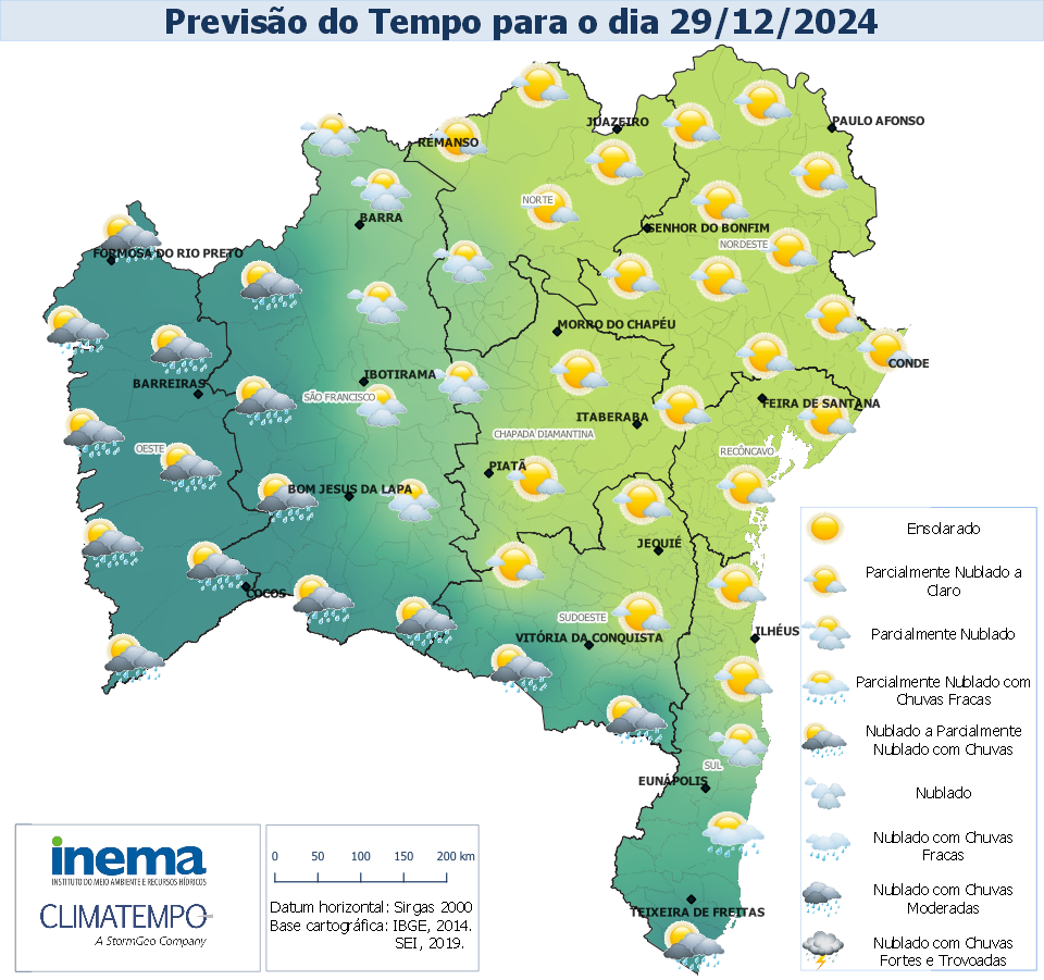No Domingo, as principais chuvas deverão ocorrer nos municípios que fazem fronteira com o estado de Minas Gerais, onde o deslocamento de umidade da Amazônia em direção ao oceano, favorece a convecção e a formação de nebulosidade, causando chuvas de intensidade fraca a moderada, sobretudo, no final da tarde. Na Chapada Diamantina, Recôncavo, Norte e Nordeste, a previsão é de céu claro a sol entre nuvens, com tempo firme em todo o período.