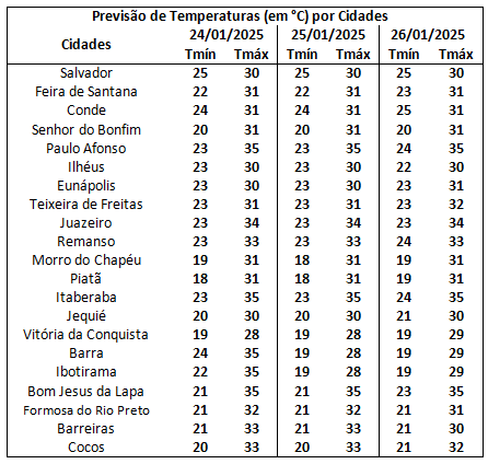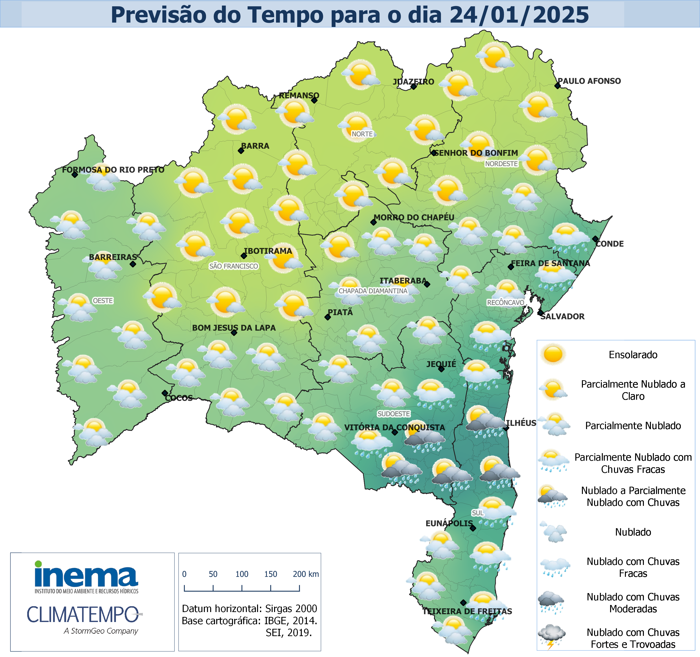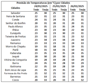 Neste domingo, o tempo se manterá com variação de nebulosidade e condições favoráveis a ocorrência de chuvas com intensidade fraca no setor centro-oeste e nos municípios costeiros. Já nas regiões do Norte e Nordeste da Bahia, a previsão é de tempo firme e ensolarado ao longo do dia. Na capital do estado o céu deve presentar variação de nebulosidade com possibilidade de chuvas de fraca intensidade e isoladas.