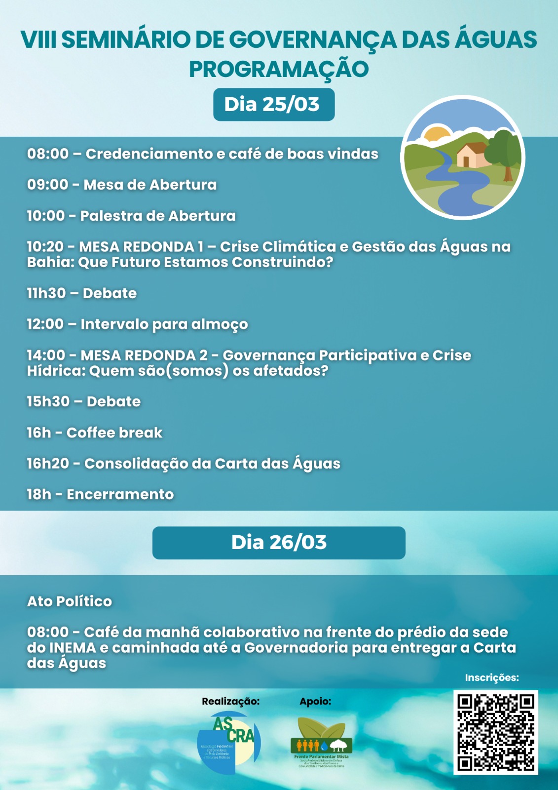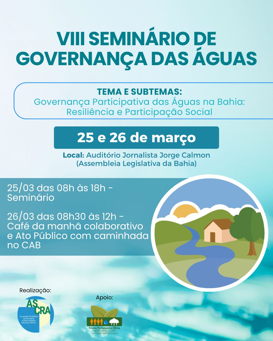 Estão abertas as inscrições para o VIII Seminário de Governança das Águas, promovido pela Associação Pré-Sindical dos Servidores do Meio Ambiente e Recursos Hídricos (ASCRA). O evento será realizado nos dias 25 e 26 de março, durante a semana comemorativa ao Dia Mundial da Água, na Assembleia Legislativa da Bahia (ALBA), Centro Administrativo (CAB), em Salvador.