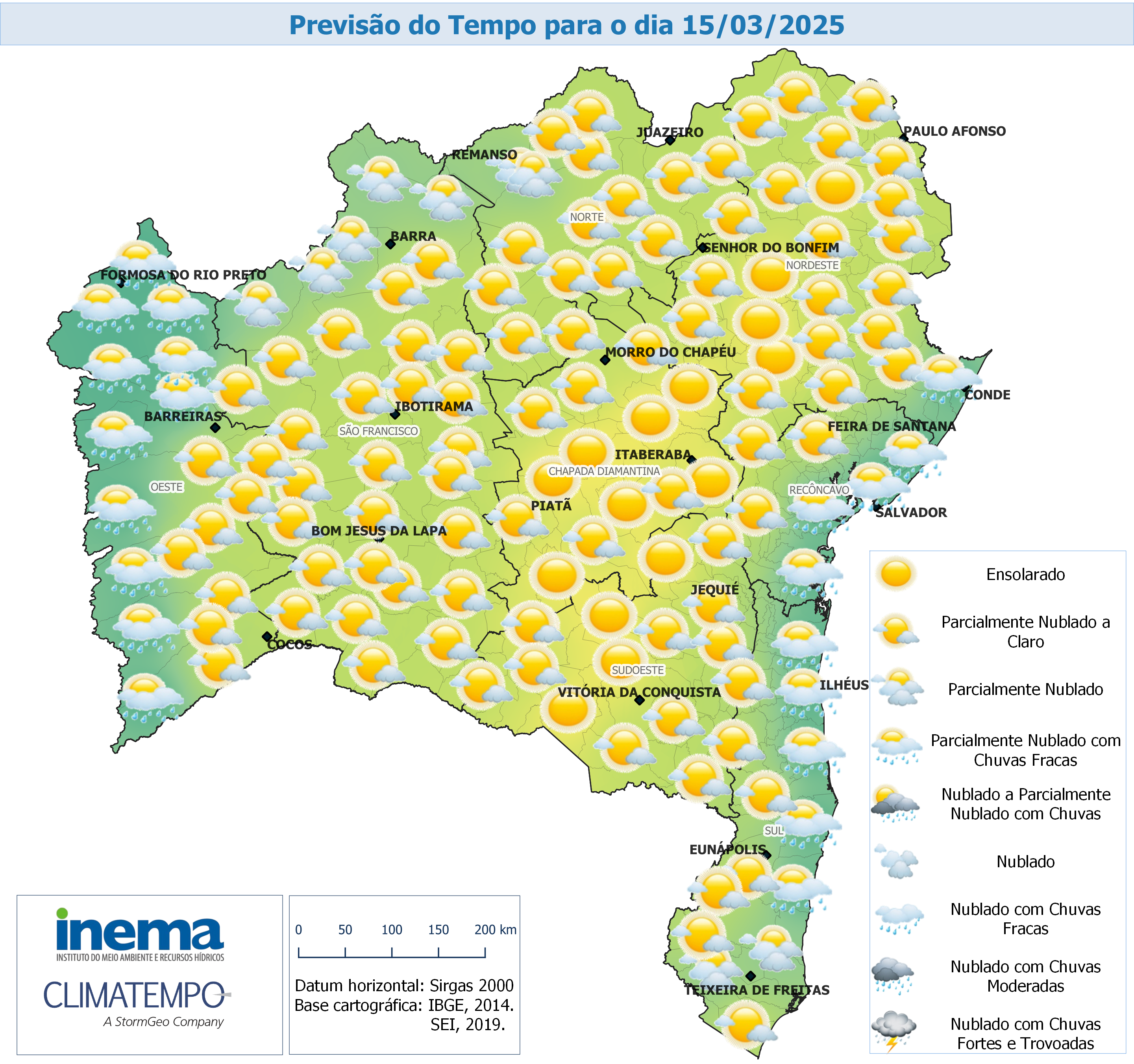 Nesta sexta-feira, o tempo segue estável e com predomínio de sol em boa parte do estado da Bahia. Na região Oeste, no Recôncavo e litoral Norte, não se descarta pancadas de chuvas no decorrer do período. Em Salvador, o tempo segue com predomínio de sol e calor. As temperaturas seguem elevadas, apresentando máximas de 34°C e mínima de 24°C.