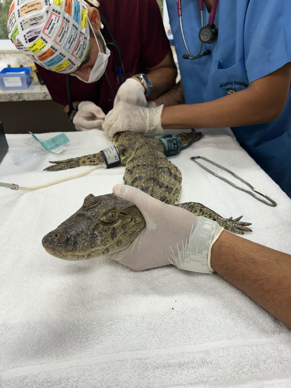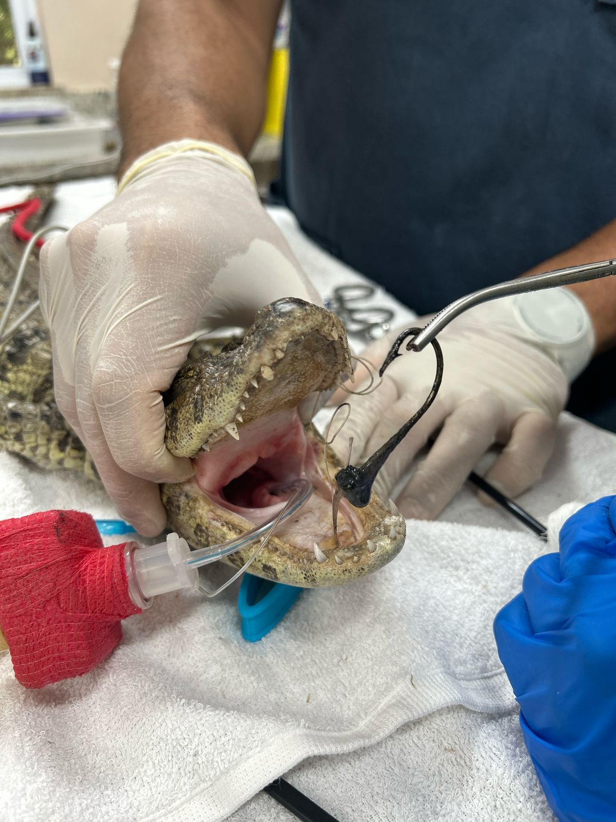 “Durante a avaliação clínica nos jacarés, procedimento padrão realizado em todos os animais que chegam ao CETAS, foi observado que eles não estavam com uma boa composição corporal, peso compatível para a espécie, além de outros parâmetros clínicos de animais saudáveis. Então eles foram submetidos a exames clínicos, laboratoriais e de radiografias, e foi nesse momento que a equipe médica do CETAS de Cruz das Almas encontrou um anzol preso no esôfago de um deles, uma fêmea jovem com cerca de 80 centímetros e pesando 1,9 quilos”, detalhou.