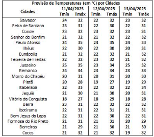 A tendência das condições do tempo para segunda-feira mostra a continuidade das instabilidades, sobretudo nas regiões do Oeste e Centro Norte da Bahia. Onde poderão ocorrer pancadas de chuvas intercalando com períodos de tempo seco. Em Salvador e região metropolitana, há possibilidade de chuvas isoladas no decorrer do período.