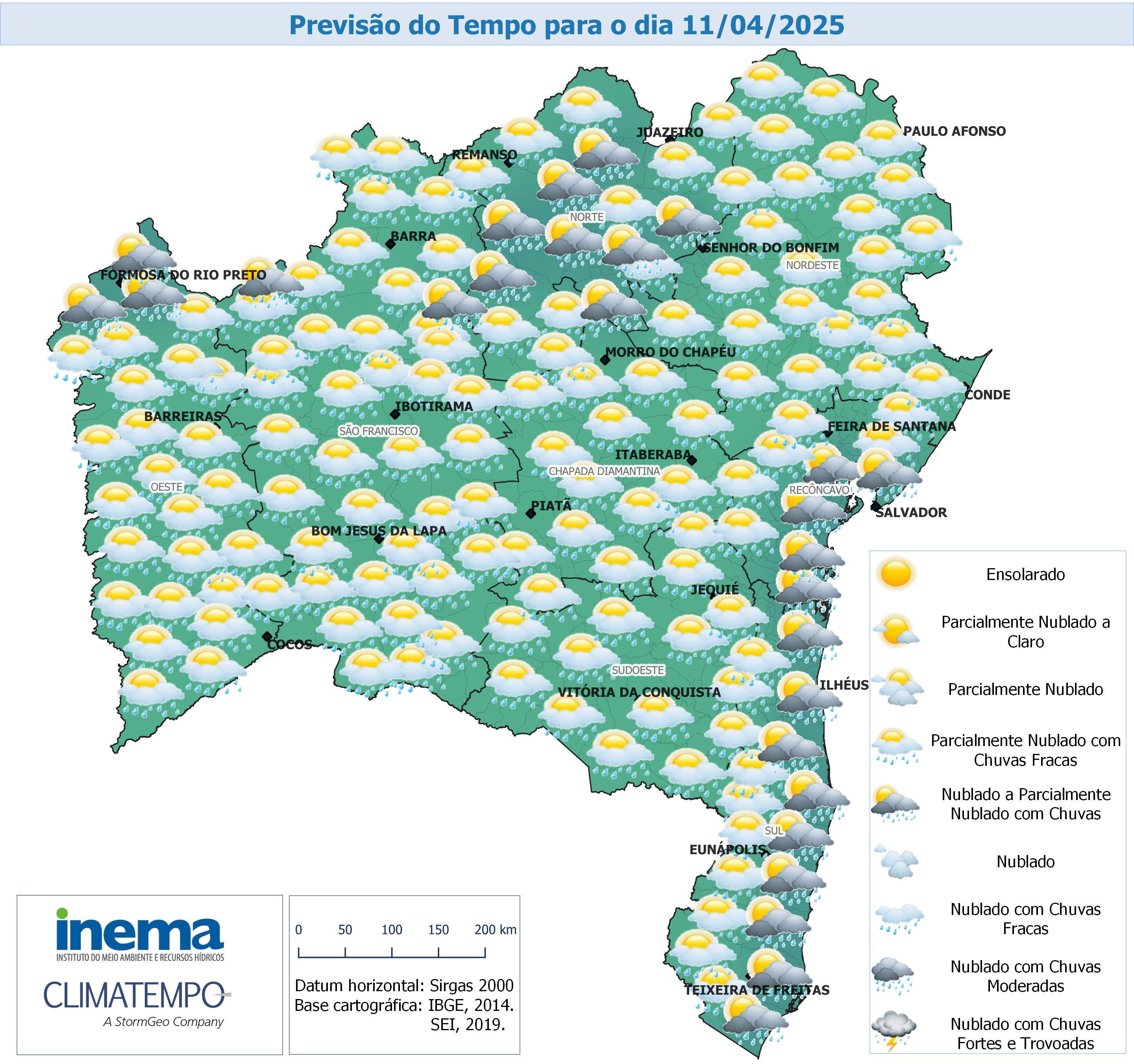 Ao longo dessa sexta-feira, o tempo segue instável e com pancadas de chuvas em todo estado. Com destaque para as regiões do Oeste, Centro Norte e Sul da Bahia. Em Salvador e região metropolitana, o tempo segue com pancadas de chuvas a qualquer hora do dia intercalando com períodos de sol. As temperaturas seguem variando com máximas de 32°C e mínima de 24°C.
