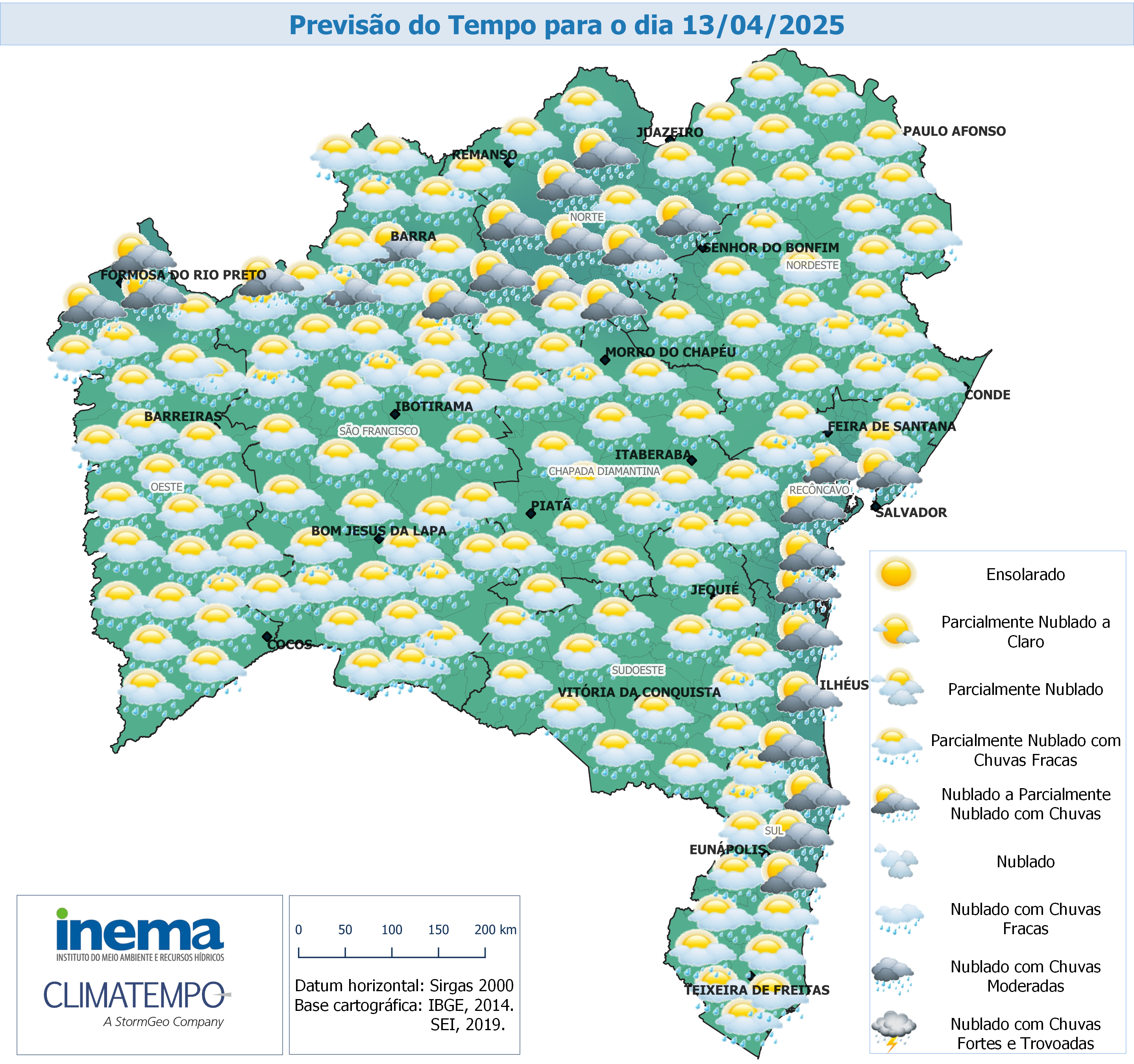 No domingo, as condições do tempo não mudam e segue com possibilidades de pancadas chuvas sobre partes do Oeste, Centro Norte e Litoral Norte da Bahia. Em Salvador e região metropolitana, a possibilidades de chuvas isoladas intercalando com períodos de tempo seco.