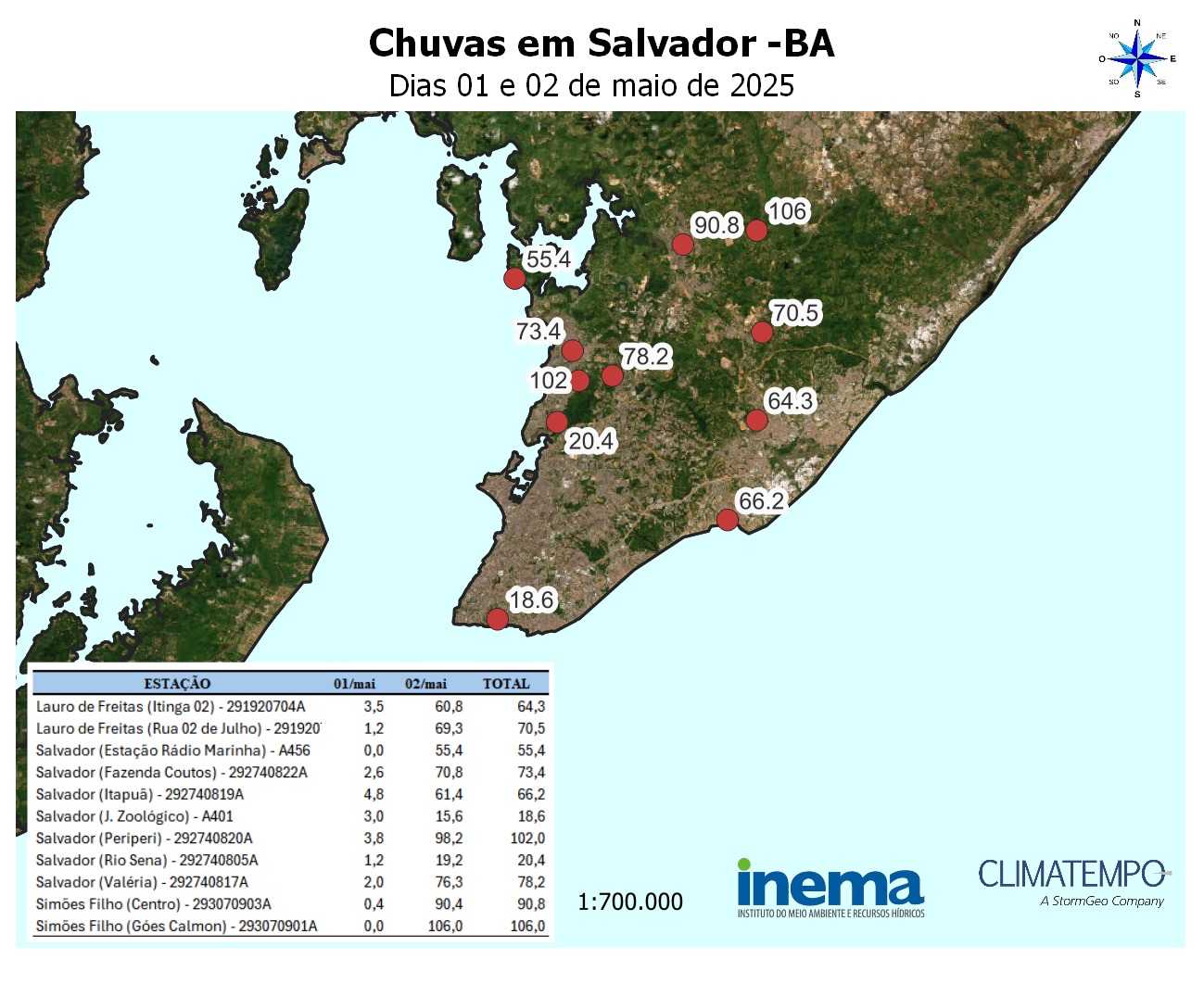 Nas últimas 24h, os maiores acumulados de chuvas foram registrados nas estações pluviométricas localizadas entre as regiões Sul, Baixo Sul e Recôncavo, onde os acumulados até o momento já superam os 200 mm (milímetros). Os maiores volumes foram verificados nos municípios de Itacaré atingido 218 mm, Taperoá (141,6 mm), Igrapiúna (136,6 mm), Santa Cruz Cabrália (127,4 mm), Simões Filho (104 mm), Camamu (100,4 mm) e Salvador (100,2 mm).