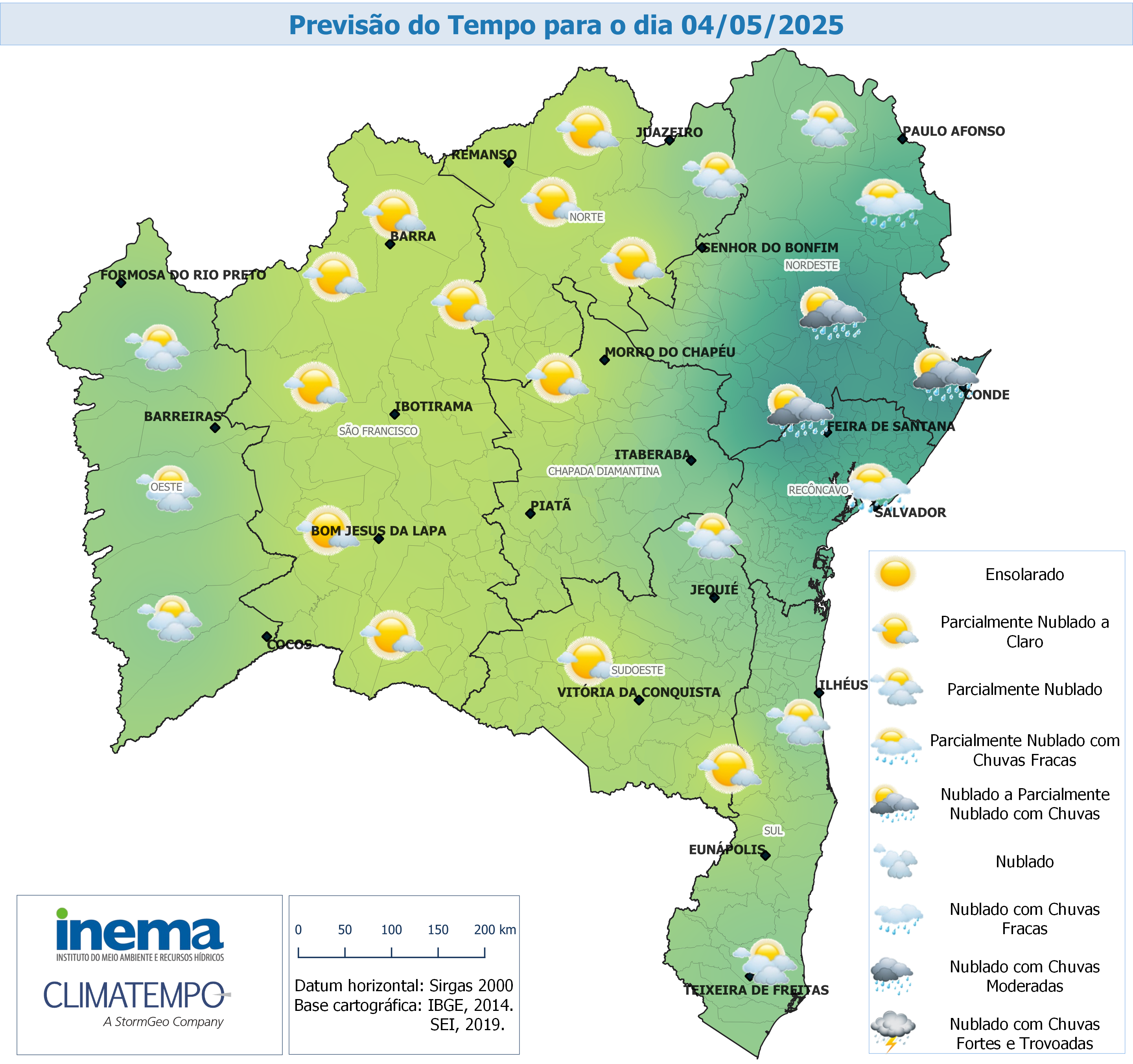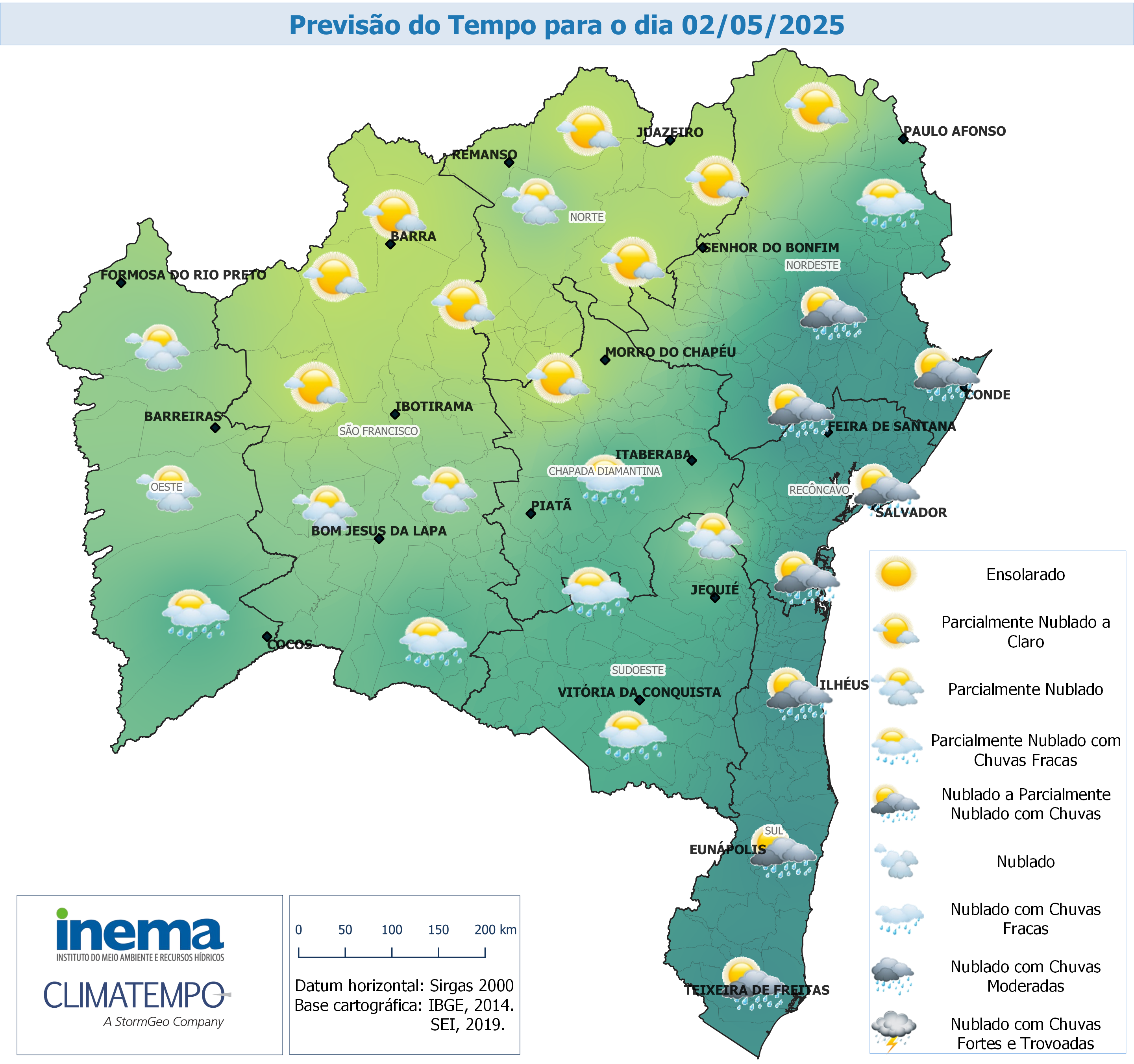 No domingo, as chuvas intensificam sobre o litoral Norte do estado. Já em Salvador e região metropolitana, a previsão é de variação de nebulosidade e possibilidade de chuvas isoladas no decorrer do período.