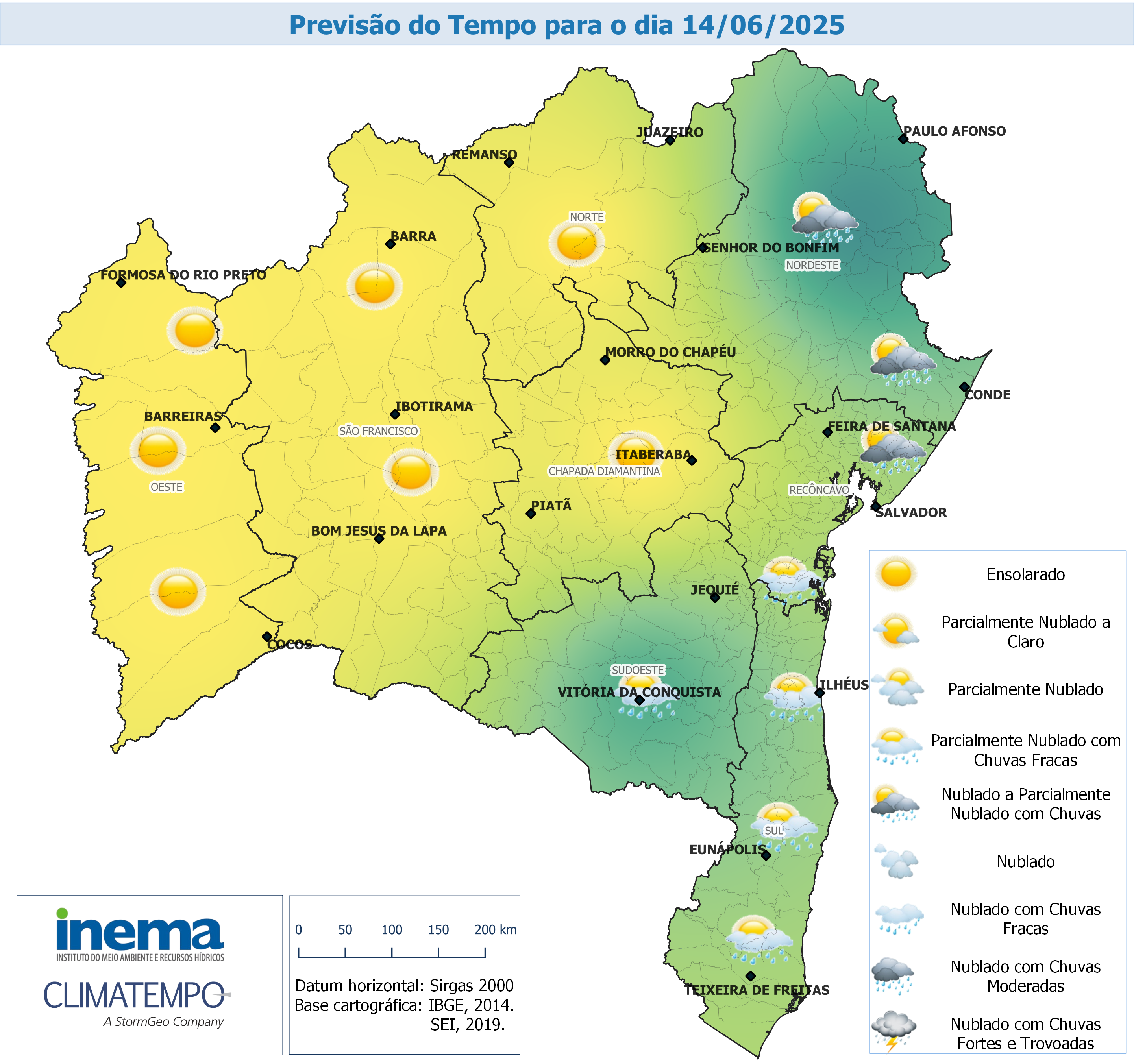 No sábado, a frente fria permanece atuando sobre o Litoral Baiano e deixa o tempo instável, principalmente sobre o Litoral Norte do estado. E a previsão é de chuvas acompanhadas por rajadas de ventos sobre a região Leste do estado. Em Salvador, região Metropolitana e Recôncavo, as instabilidades diminuem e a previsão de chuvas isoladas seguidas também por rajadas de vento.