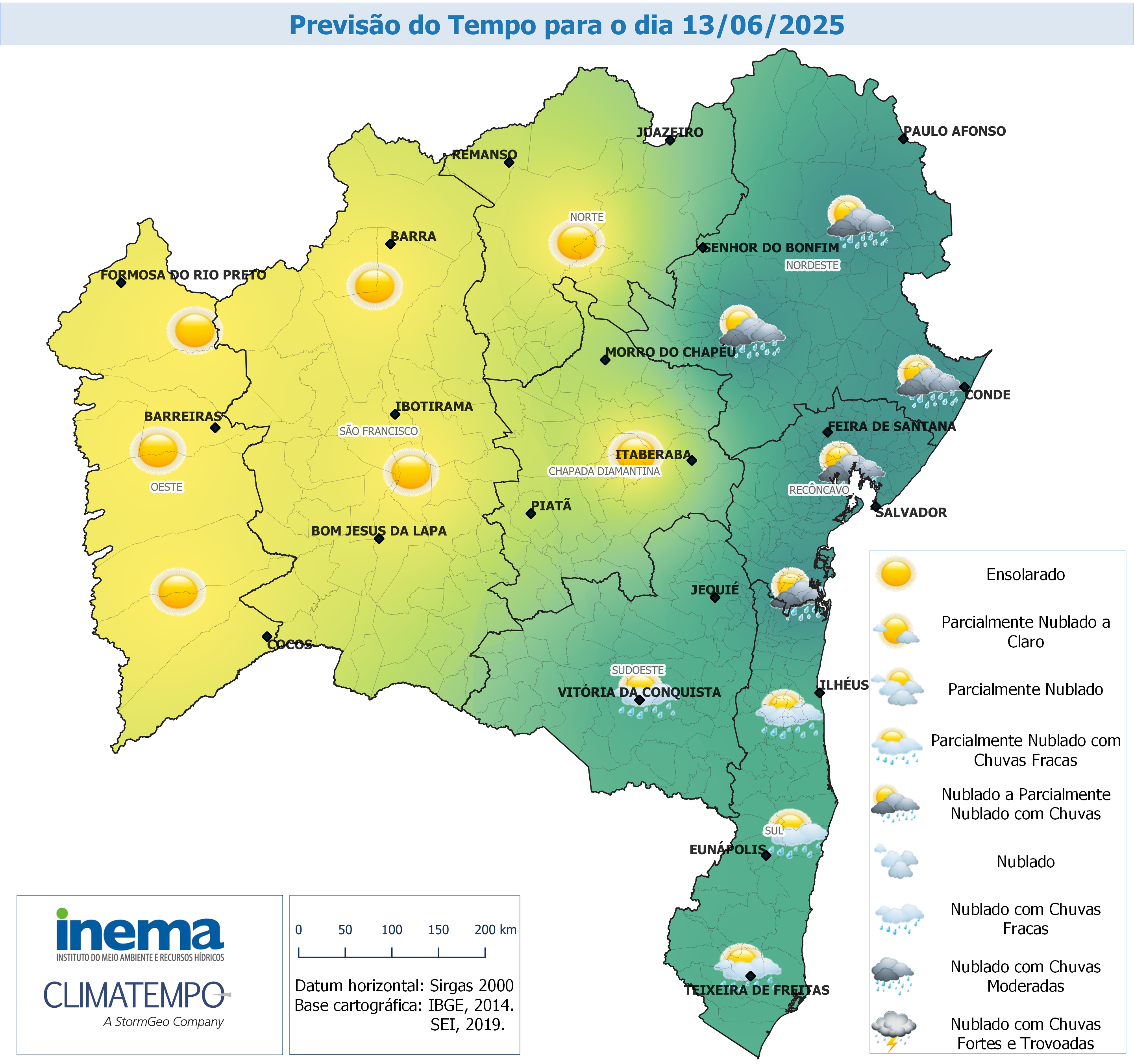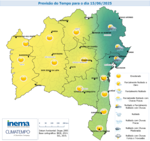 No domingo as chuvas diminuem sobre o estado e a previsão é de variação de nebulosidade com possibilidade de chuvas isoladas intercalando com períodos de sol sobre o Litoral. Nas demais regiões da Bahia, a previsão é de predomínio de sol e tempo seco. Já em Salvador, Recôncavo e região Metropolitana, a previsão é de céu parcialmente nublado com possibilidades de chuvas rápidas seguidas por rajadas de vento.