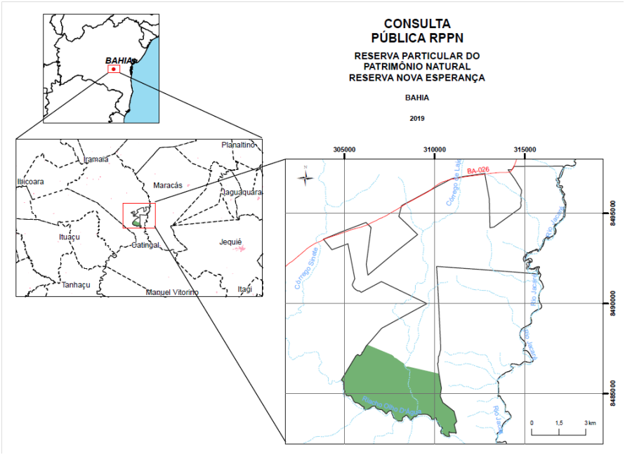 O INSTITUTO DO MEIO AMBIENTE E RECURSOS HÍDRICOS - INEMA torna público, em observância ao disposto no art.22, §2° e 3º, da Lei n 9.985, de 18.07.2000, e de acordo com o art. 5º, § 1°, do Decreto nº. 4.340, de 22 de agosto de 2002, que está estudando a proposta de reconhecimento da Reserva Particular do Patrimônio Natural – RPPN, denominada Reserva Nova Esperança, com área de 1.634,3327 ha, de propriedade da Fazenda Reunidas Santa Maria Ltda, localizada no município de Iramaia, Bahia e registrada no Cartório de Registro de Imóveis do município de Iramaia.