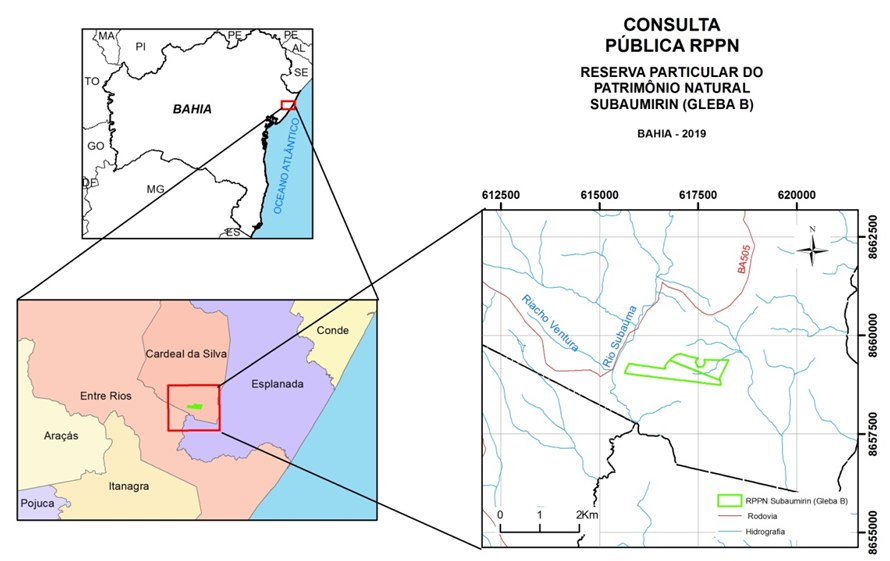 O INSTITUTO DO MEIO AMBIENTE E RECURSOS HÍDRICOS - INEMA torna público, em observância ao disposto no art.22, §2° e 3º, da Lei n 9.985, de 18.07.2000, e de acordo com o art. 5º, § 1°, do Decreto nº. 4.340, de 22 de agosto de 2002, que está estudando a proposta de reconhecimento da Reserva Particular do Patrimônio Natural – RPPN, denominada Subaumirin (Gleba B), com área de 107,9450 ha, em propriedades da Copener Florestal Ltda., localizadas no município de Cardeal da Silva, Bahia e registradas no Cartório de Registro de Imóveis do município de Entre Rios.