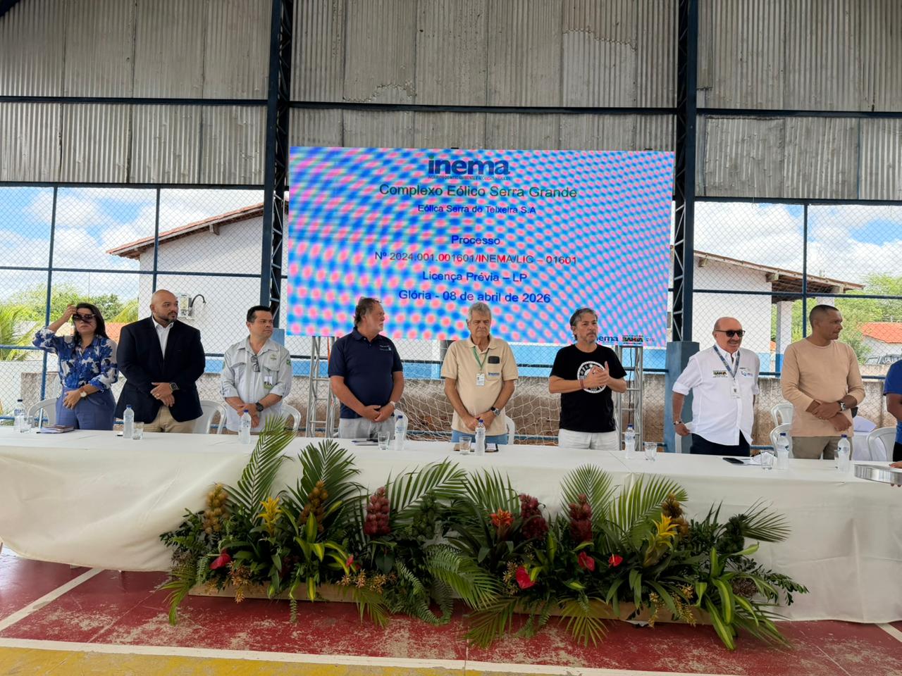 O Instituto do Meio Ambiente e Recursos Hídricos (Inema) conduziu, nesta quarta-feira (08), a audiência pública de apresentação do Estudo de Impacto Ambiental e do Relatório de Impacto Ambiental (EIA/Rima) do Projeto Complexo Eólico Serra Grande, de titularidade da empresa Eólica Serra do Teixeira. O encontro foi realizado no Ginásio de Esportes da Escola Municipal Estevão Gomes de Souza, situada no povoado Agrovila 1 Jusante, zona rural do município de Glória/BA e reuniu cerca de mais de 100 participantes, representantes do poder público, comunidades locais, empresas e consultorias técnicas.
